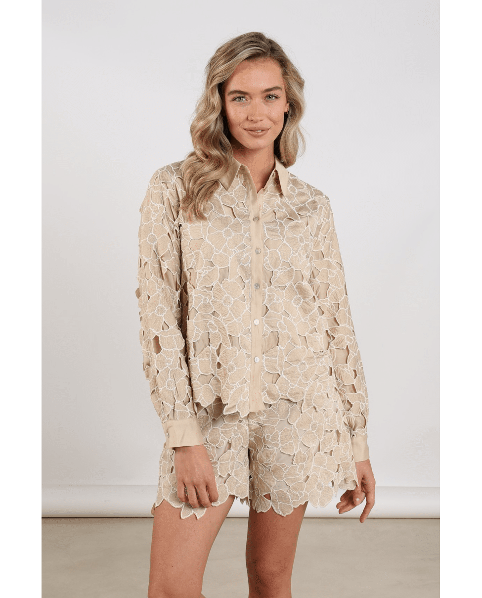 De Chloe Blouse Flower van NUKUS is een elegante dames blouse met verfijnde bloemenapplicatie en subtiele opengewerkte details. Deze blouse met flower design is perfect voor een stijlvolle lente- of zomerlook, zowel casual als gekleed.