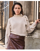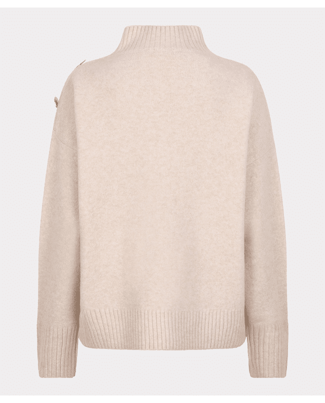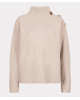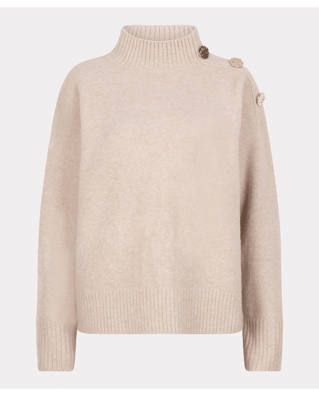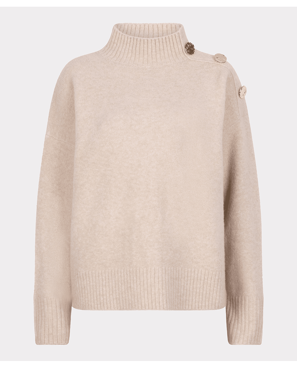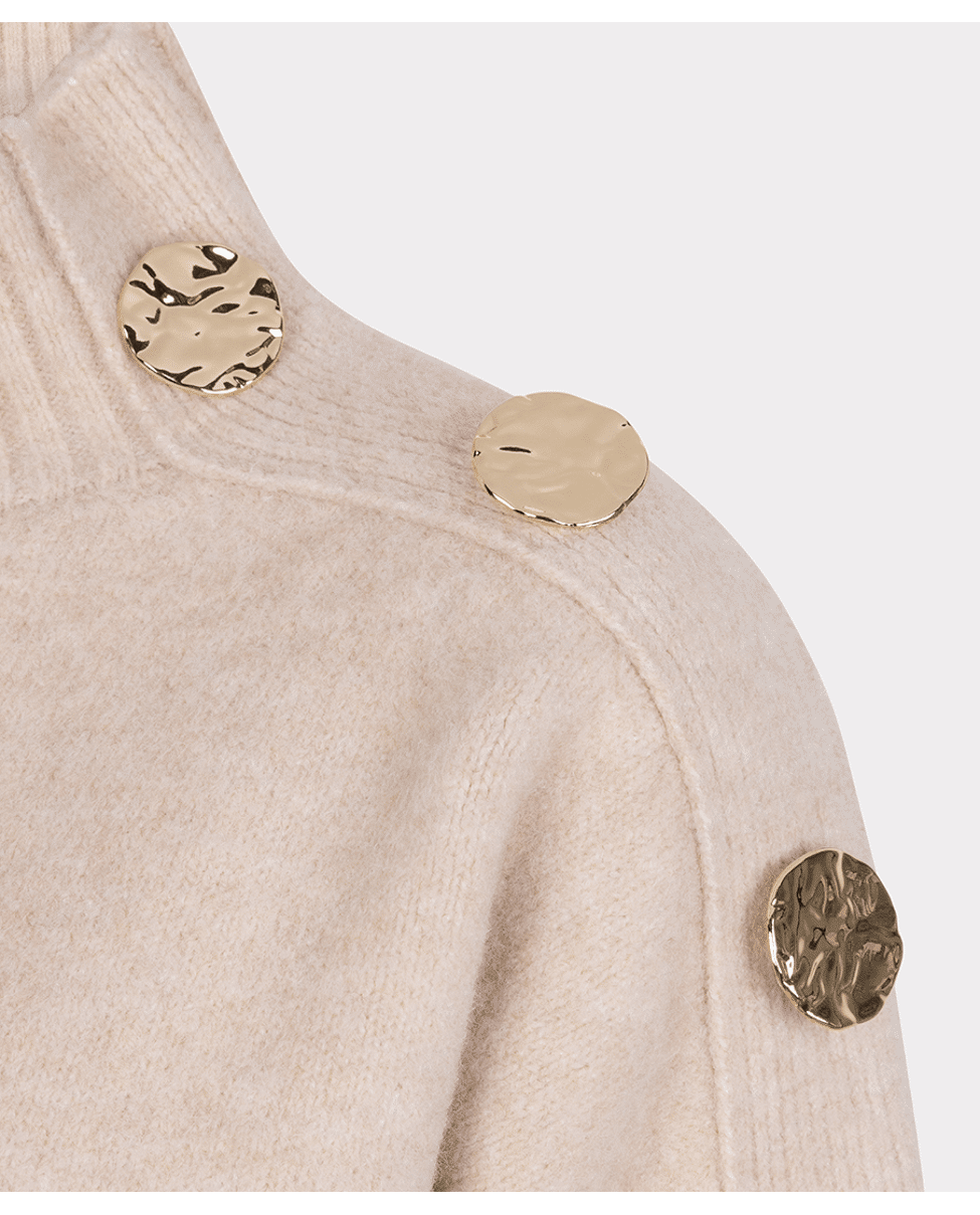 Zachte coltrui in een warme zandtint, met goudkleurige knopen op de schouder als subtiel detail. Ideaal voor frisse dagen waarop je stijlvol en comfortabel voor de dag wilt komen.