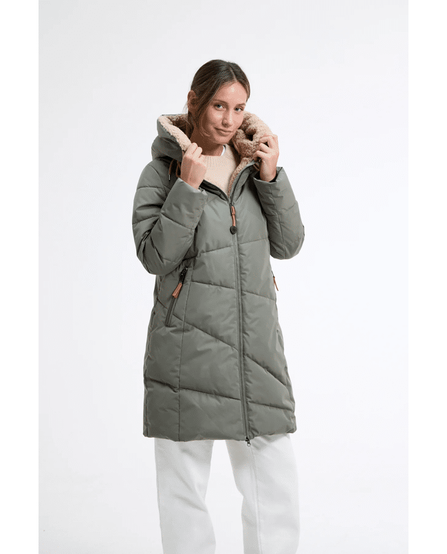 Halflange, gewatteerde jas voor dames, perfect voor koude, natte dagen. De gevoerde capuchon en windvangers in de mouwen zorgen voor warmte en comfort – ook als het flink waait.