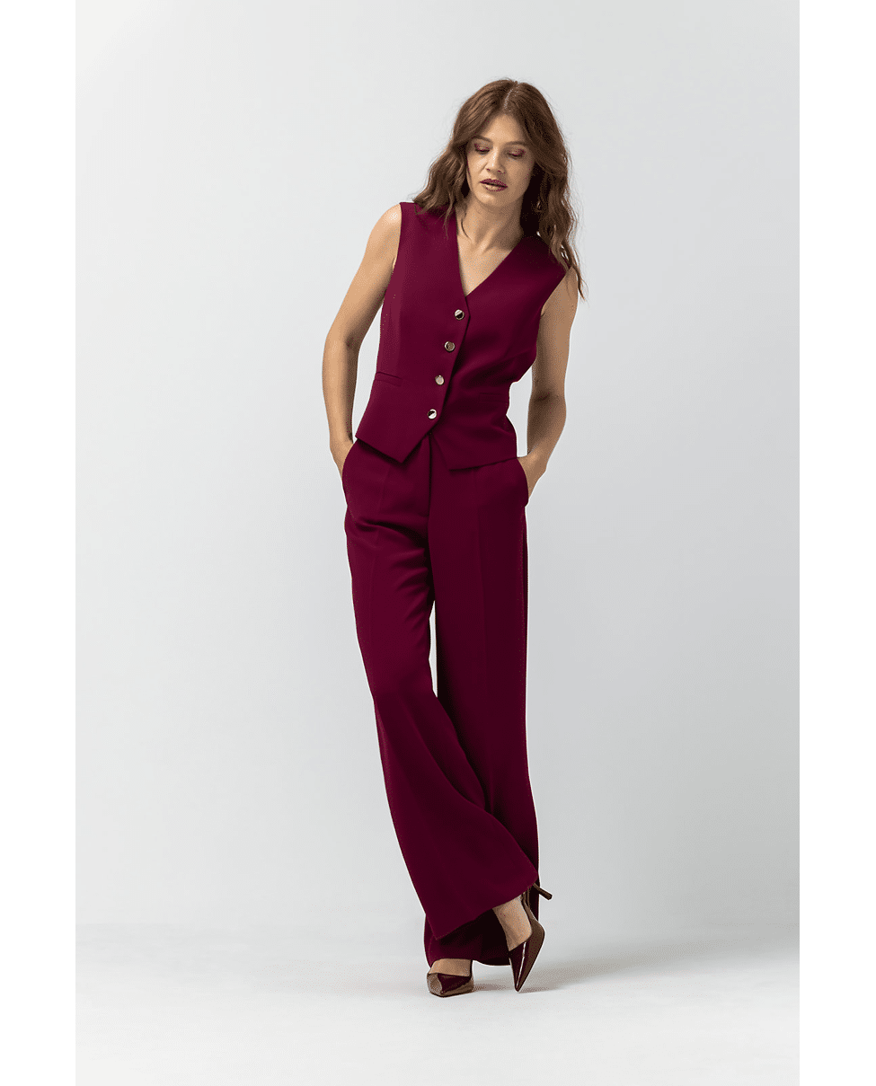 De diepe warme kleur en de stoere knopen geven dit gilet een moderne twist – perfect voor een gelaagde, stijlvolle herfstlook.
