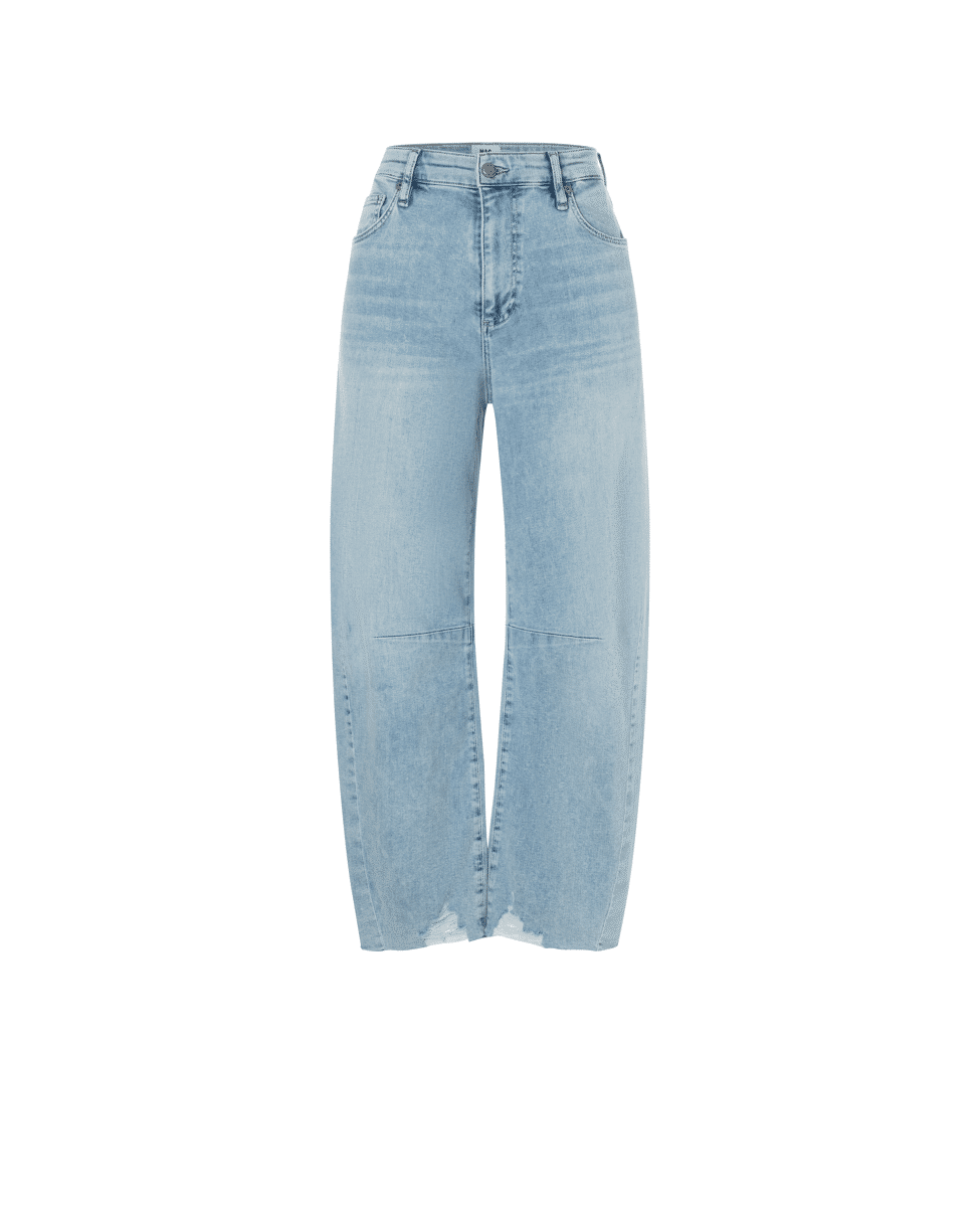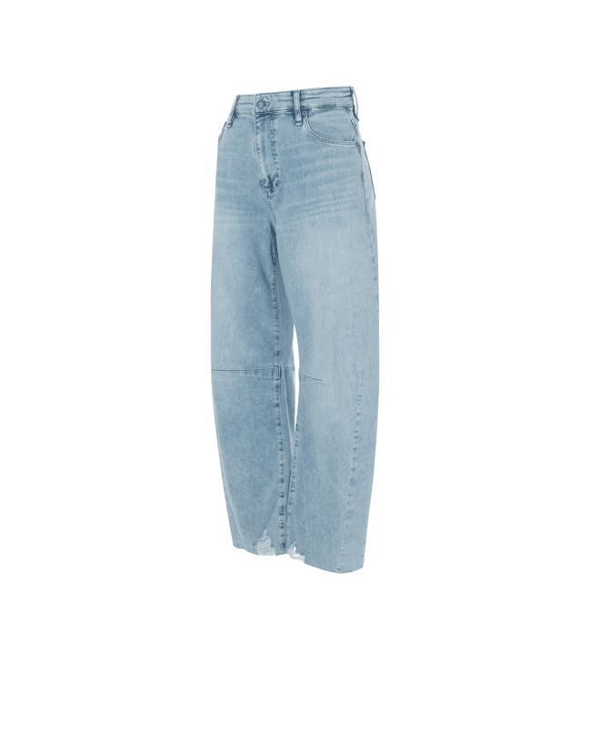 Deze lichtblauwe barrel jeans is een speelse, moderne keuze voor het voorjaar. De hoge taille en ronde pijpen geven je outfit een eigentijdse twist met een comfortabel silhouet.