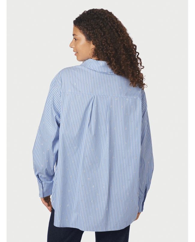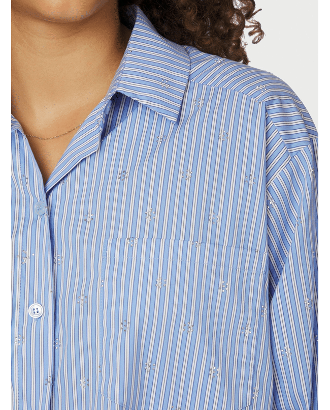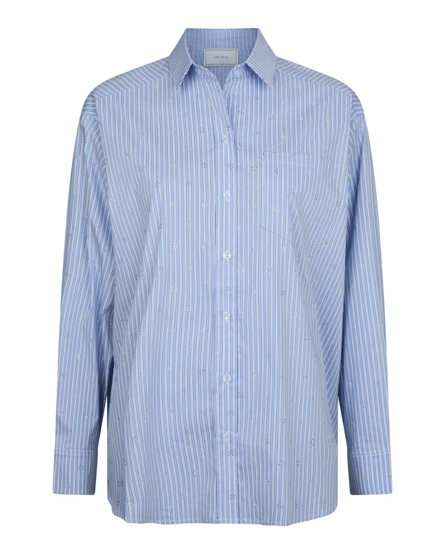 De Dalma Decoration Shirt van Neo Noir is een gestreepte damesblouse met een moderne, oversized fit. De subtiele stras-steentjes geven dit klassieke overhemd nét wat extra’s, perfect voor een stijlvolle werkdag of een casual-chique look met jeans. Een frisse blauw-witte blouse die je makkelijk het hele seizoen door draagt.