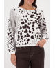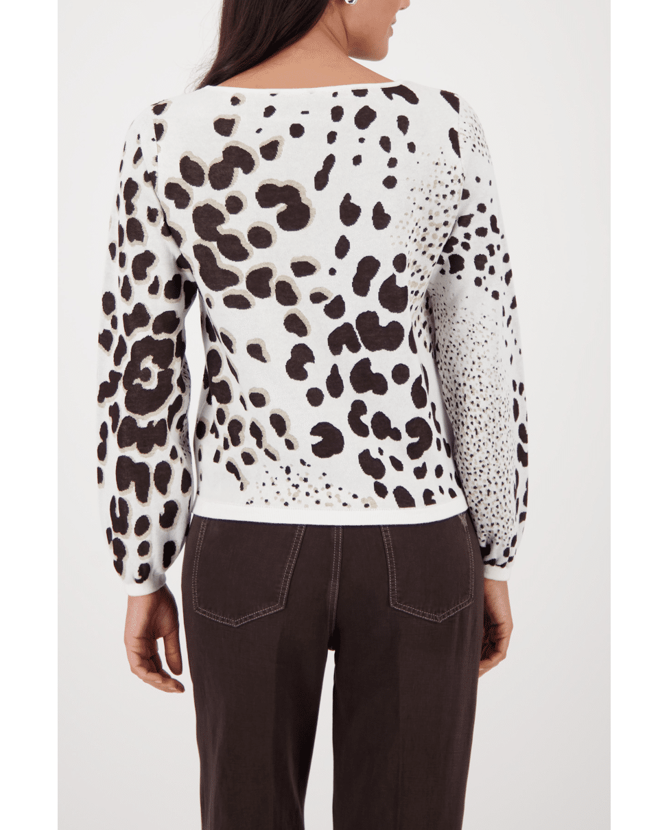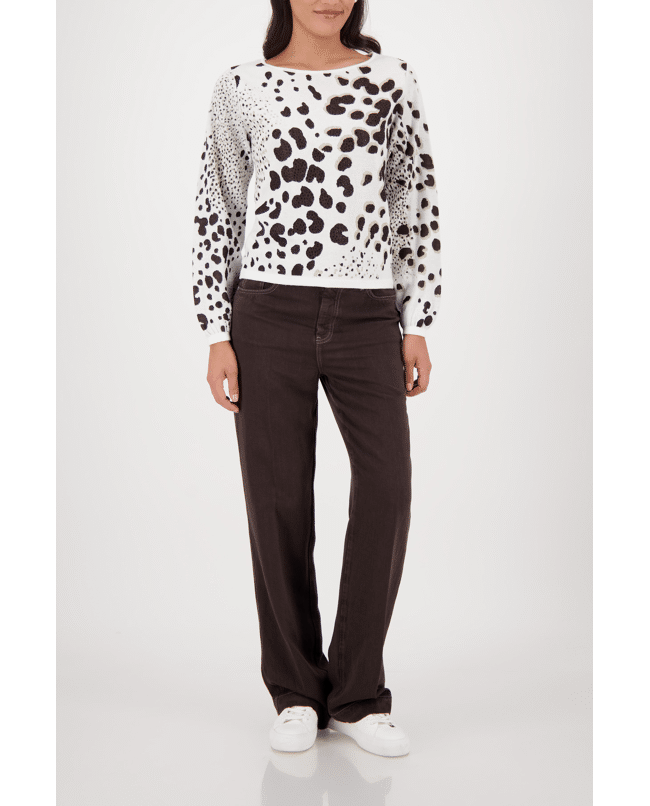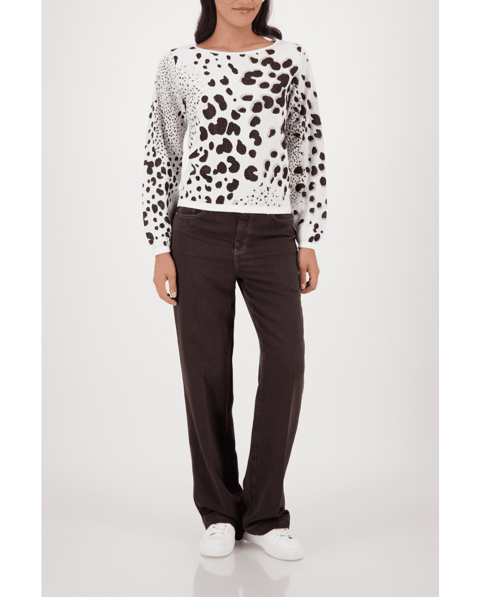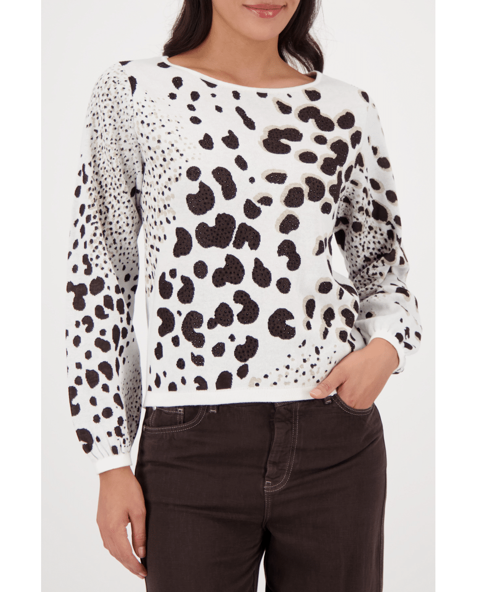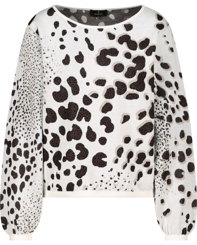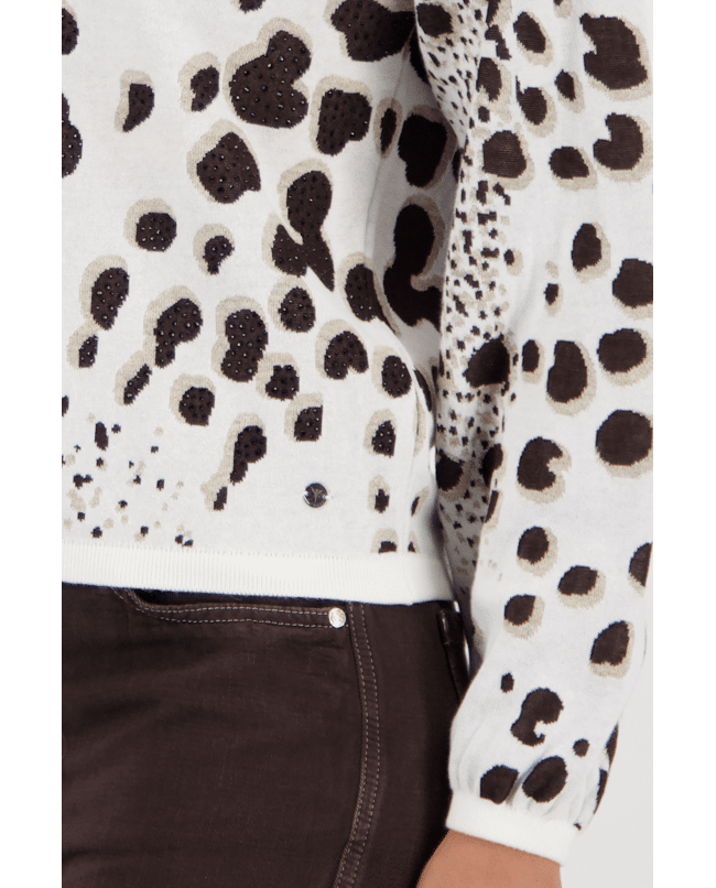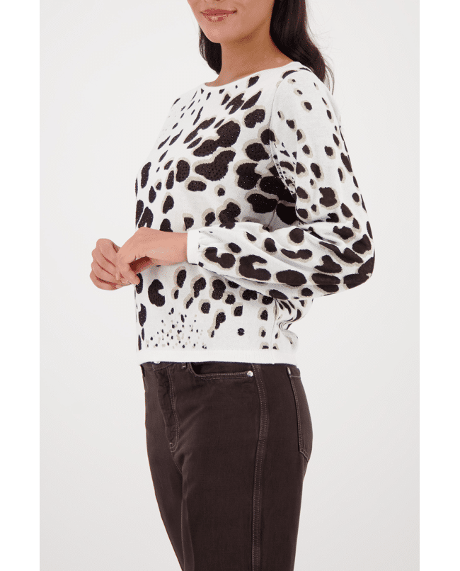 Damestrui van Monari met luipaardbreisel versierd met strassteentjes, ronde halslijn en lange mouwen