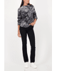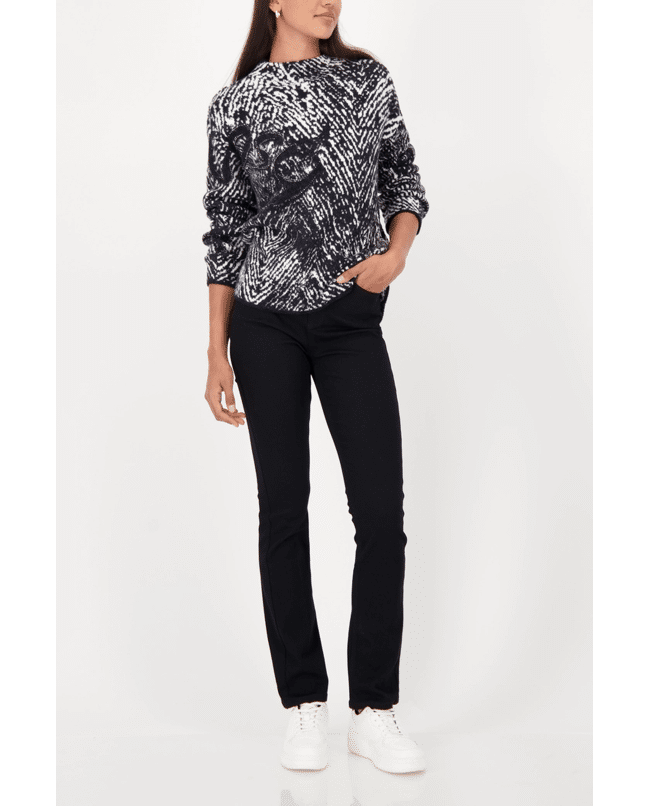 Deze trui is een echte blikvanger dankzij het grafische visgraatmotief en de subtiele strass-details. Perfect voor wie comfort wil combineren met karakter.