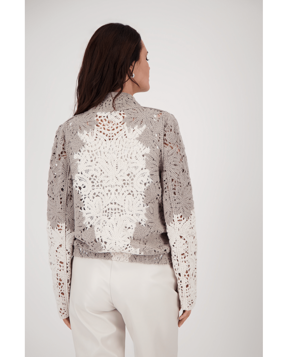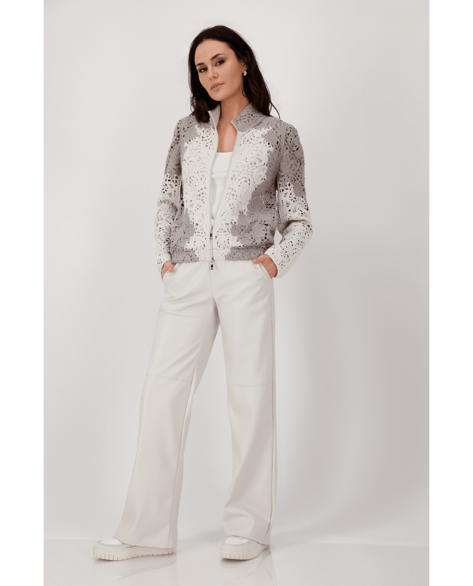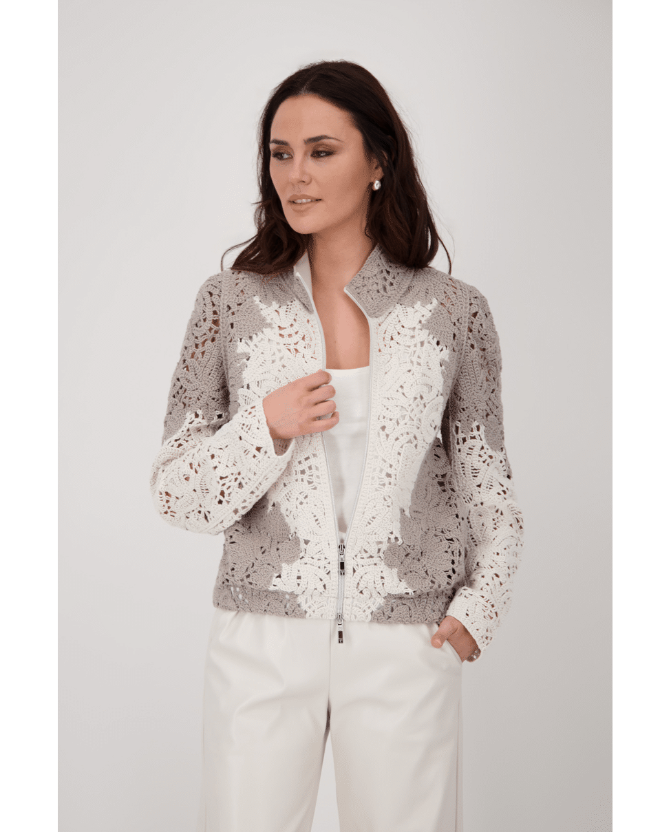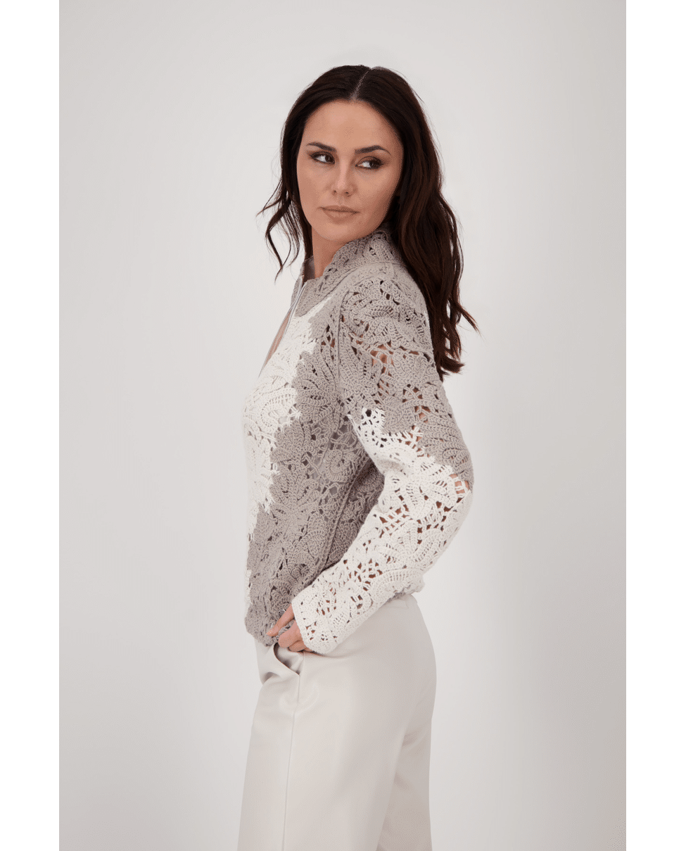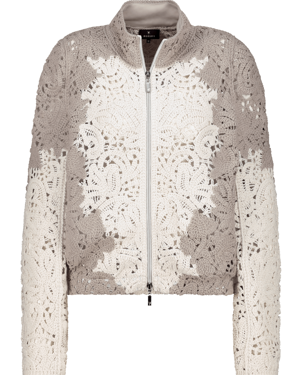 Damesvest van Monari met cornelli-patroon met kantdetails, ritssluiting en lange mouwen