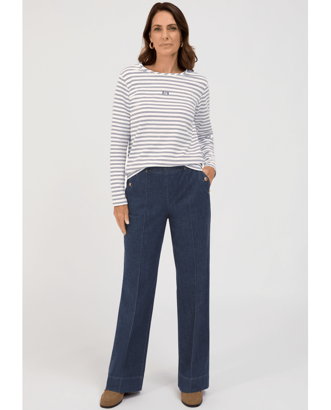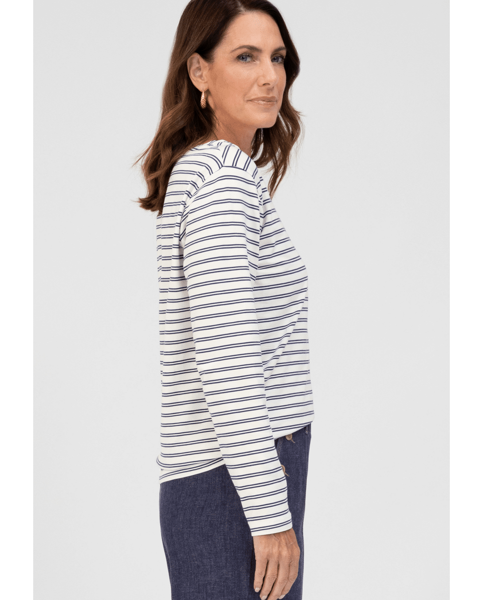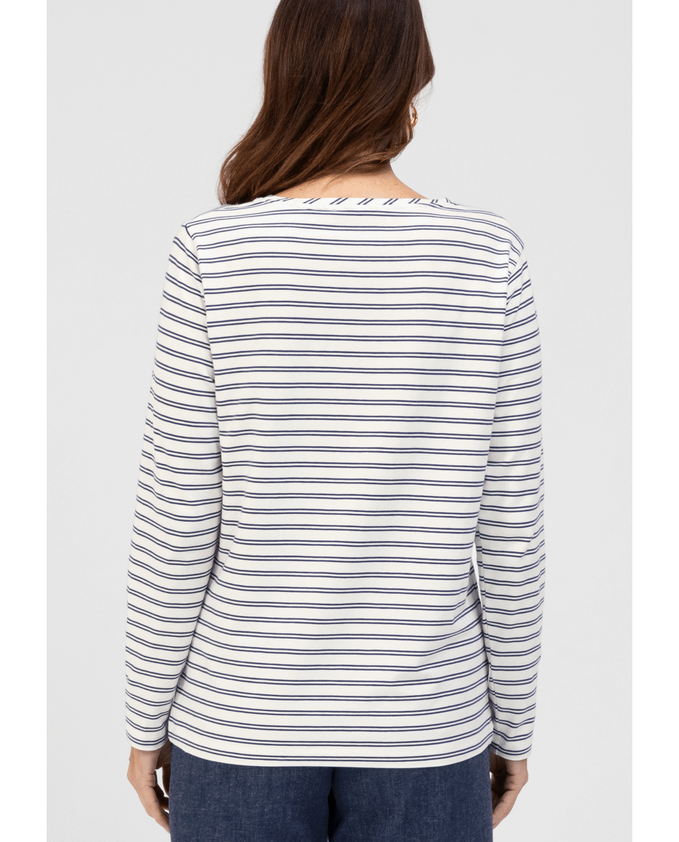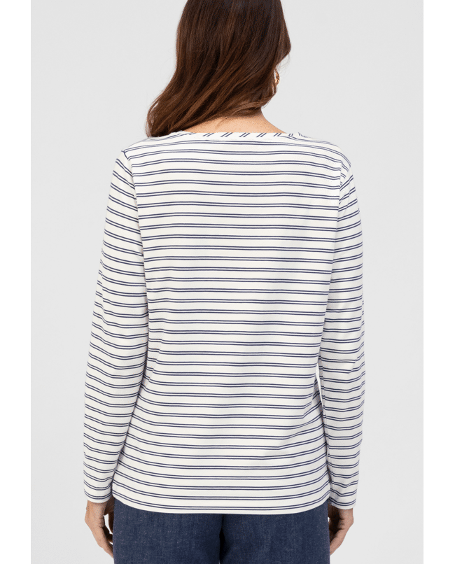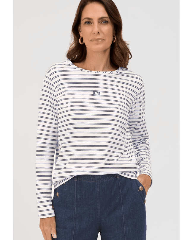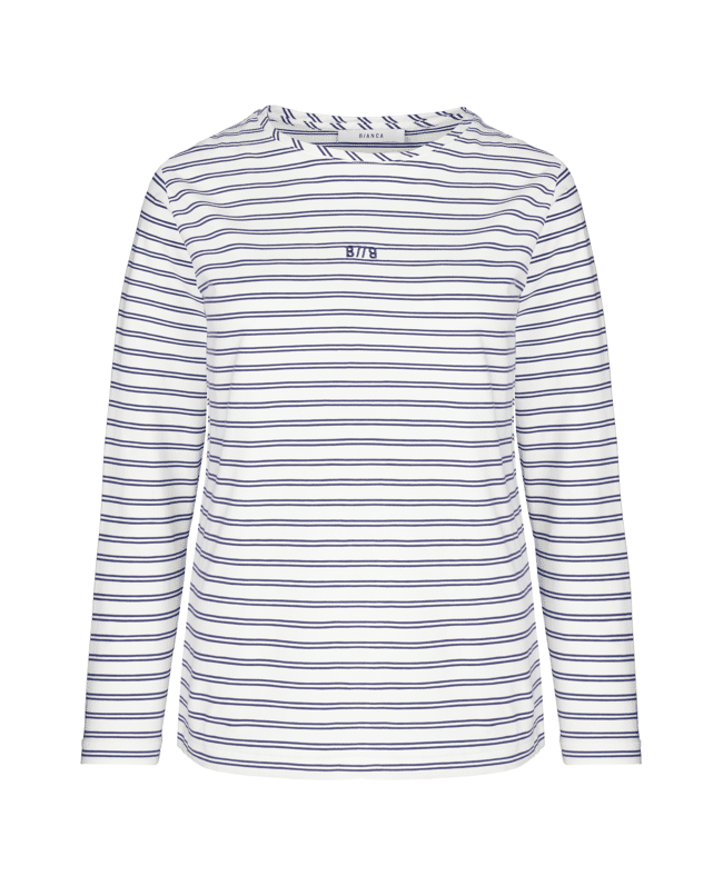 Het DAMI T-shirt van Bianca is een moderne basic met fijne dubbele streep. Ideaal voor een relaxte voorjaarslook met een vleugje maritieme flair.