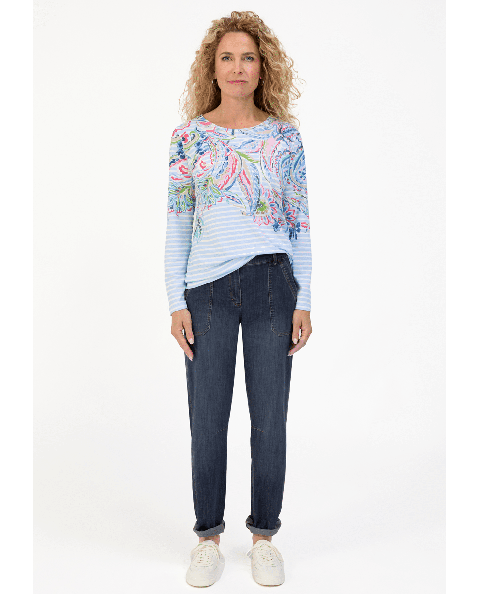 Dit gestreepte T-shirt van Bianca krijgt een speelse twist door de kleurrijke paisleyprint. Een luchtig item dat meteen opvalt – en heerlijk zit.
