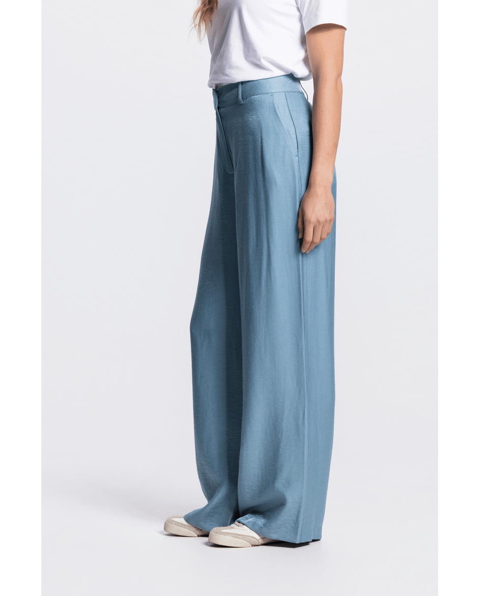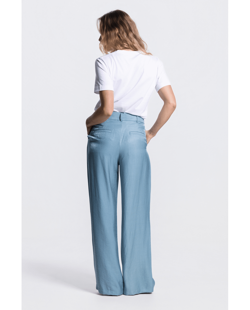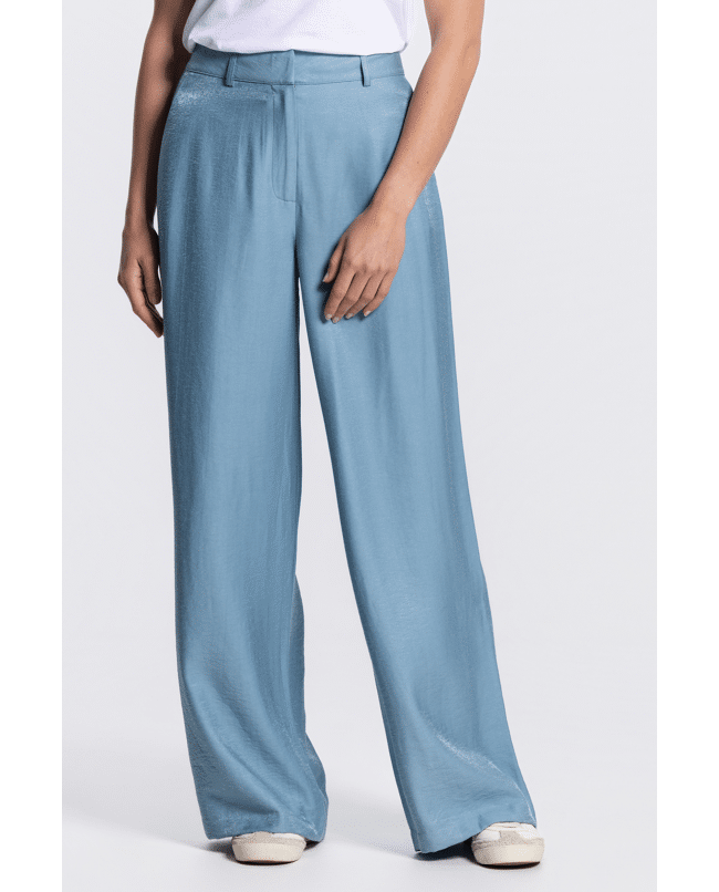 Deze glanzende wide leg broek is een elegante toevoeging aan je zomergarderobe. De vloeiende stof en vrouwelijke snit maken ‘m geschikt voor zowel casual als geklede momenten.