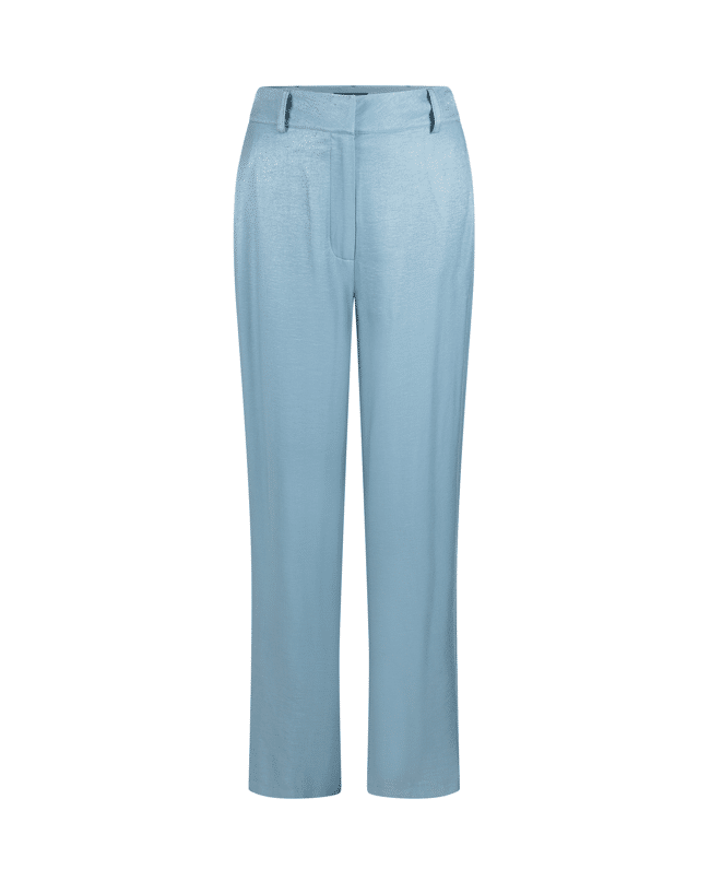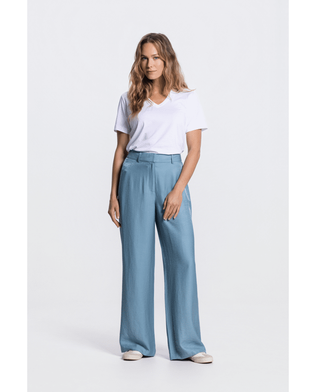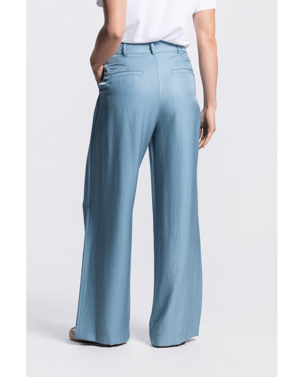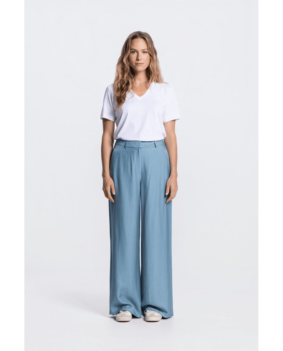 Deze glanzende wide leg broek is een elegante toevoeging aan je zomergarderobe. De vloeiende stof en vrouwelijke snit maken ‘m geschikt voor zowel casual als geklede momenten.