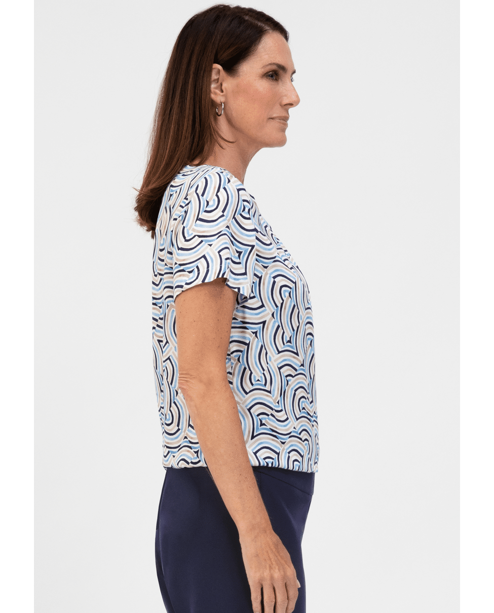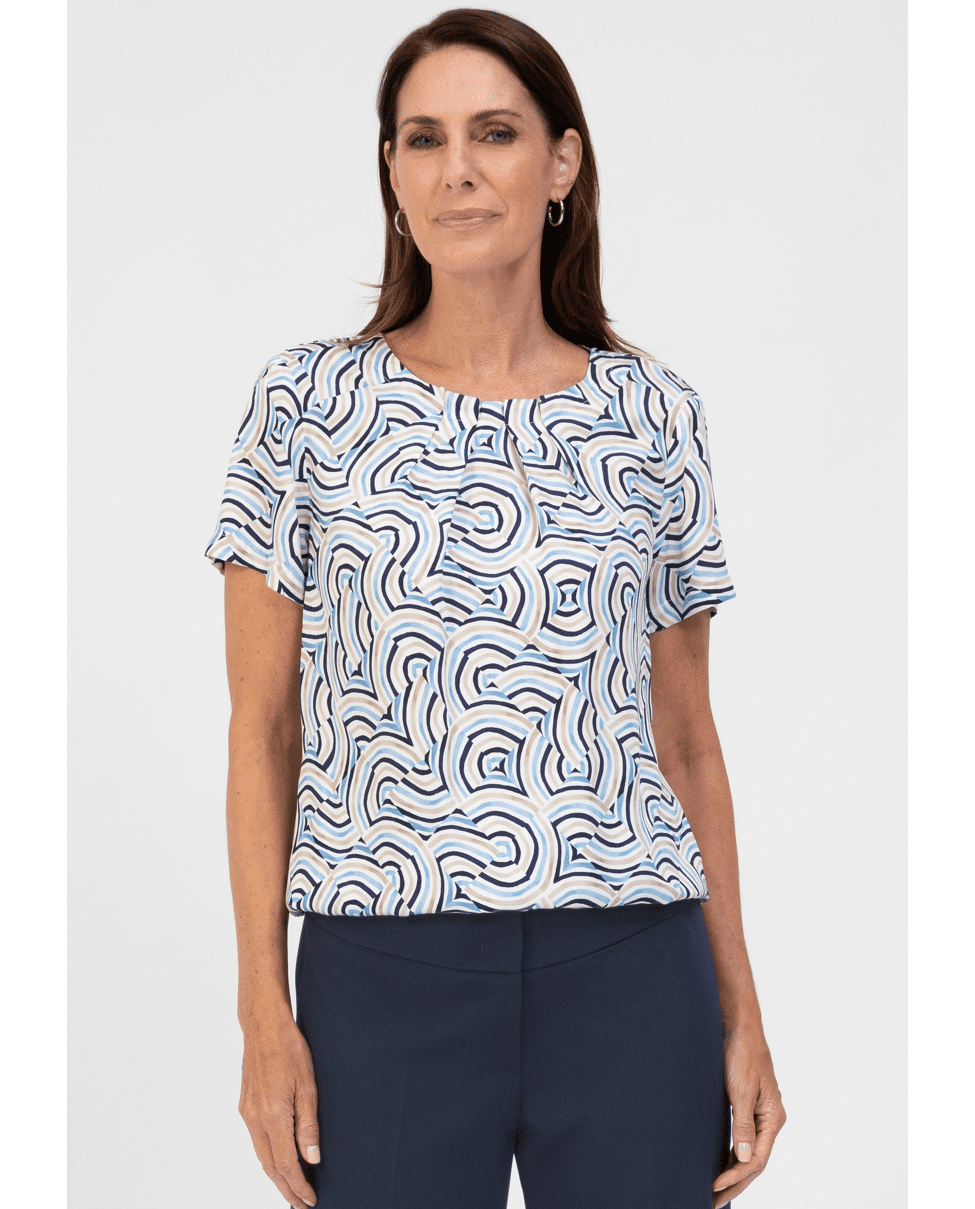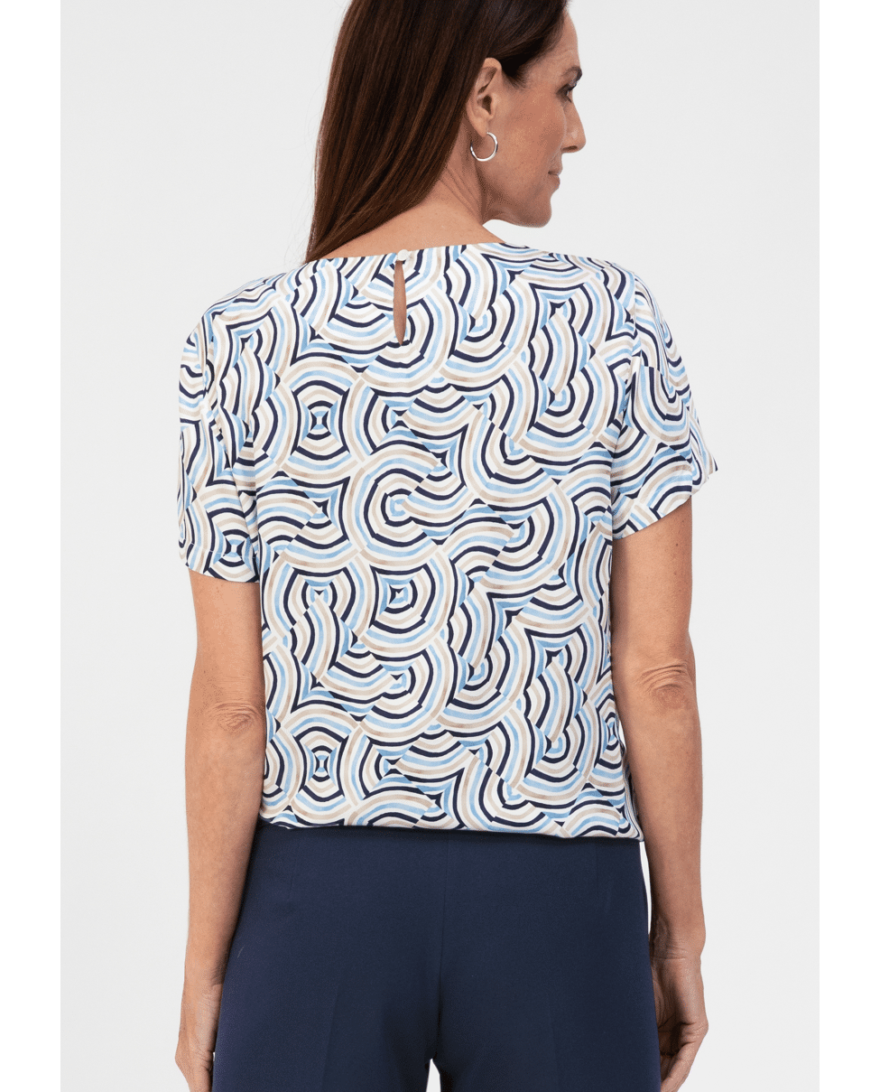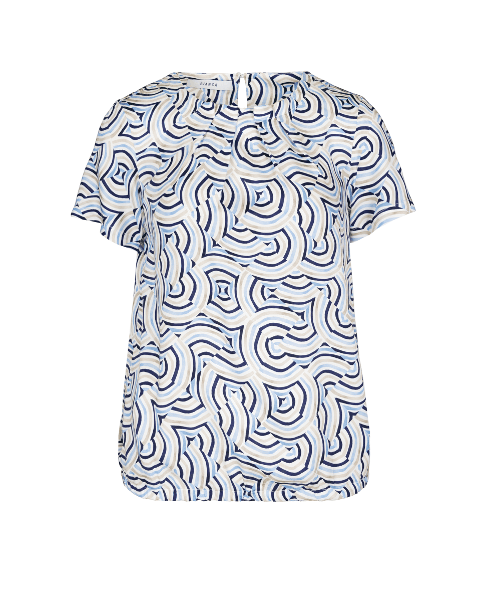 De DARIN dames blousetop van BIANCA is een elegante en luchtige top met een organische print in frisse blauwtinten. De speelse belijning en het vloeiende dessin geven deze top een moderne uitstraling, perfect voor het voorjaar en de zomer.