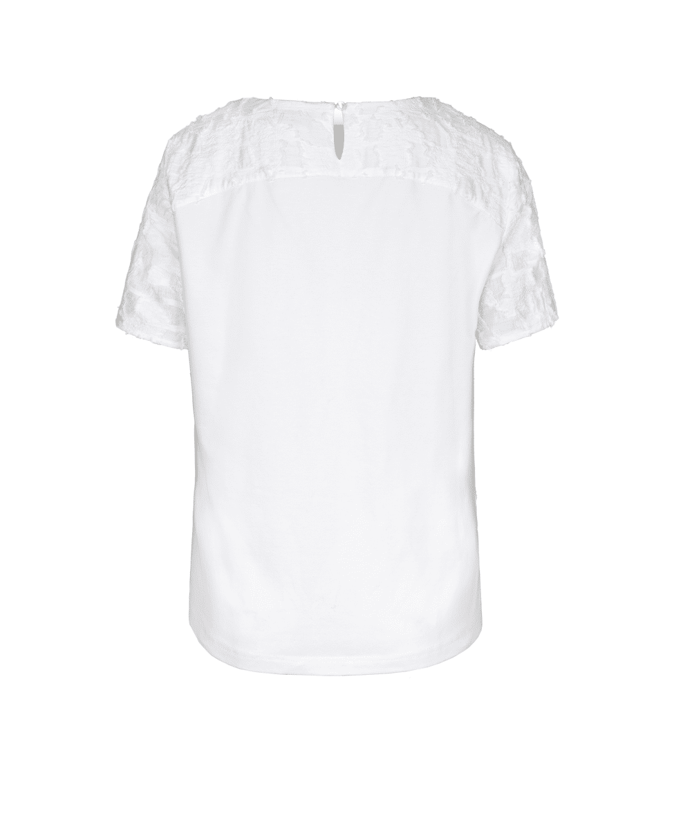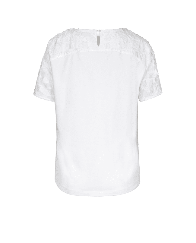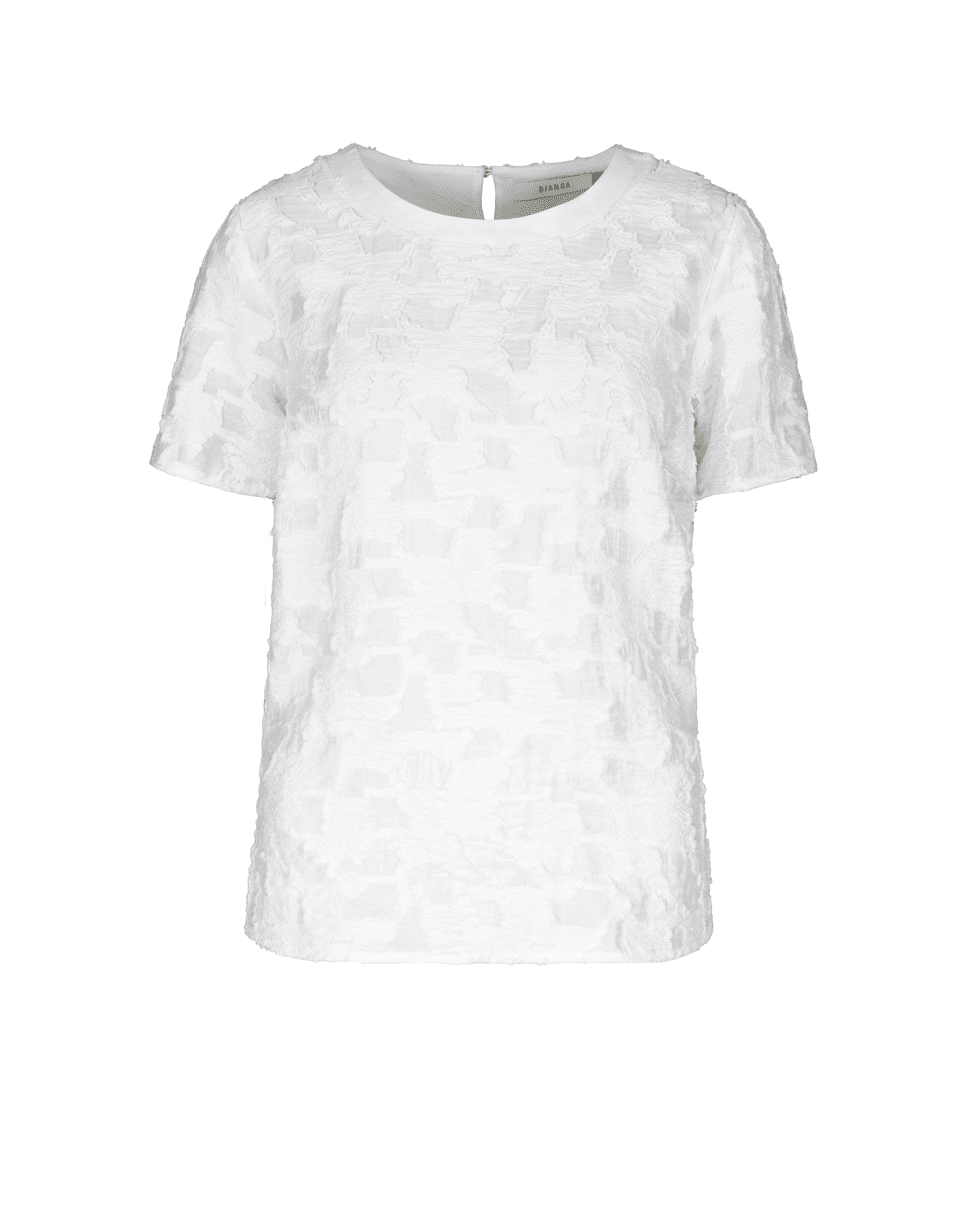 Het DARNI dames T-shirt van BIANCA is een verfijnde witte top met een subtiel abstract 3D-patroon. De rijke structuur geeft dit shirt net wat extra, terwijl de ronde hals en korte mouwen zorgen voor een tijdloze uitstraling. Mooi op een lichte broek of onder een blazer in het voorjaar en de zomer.