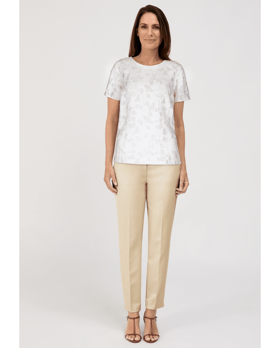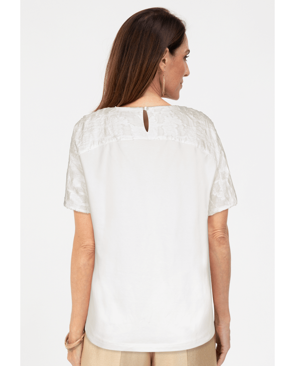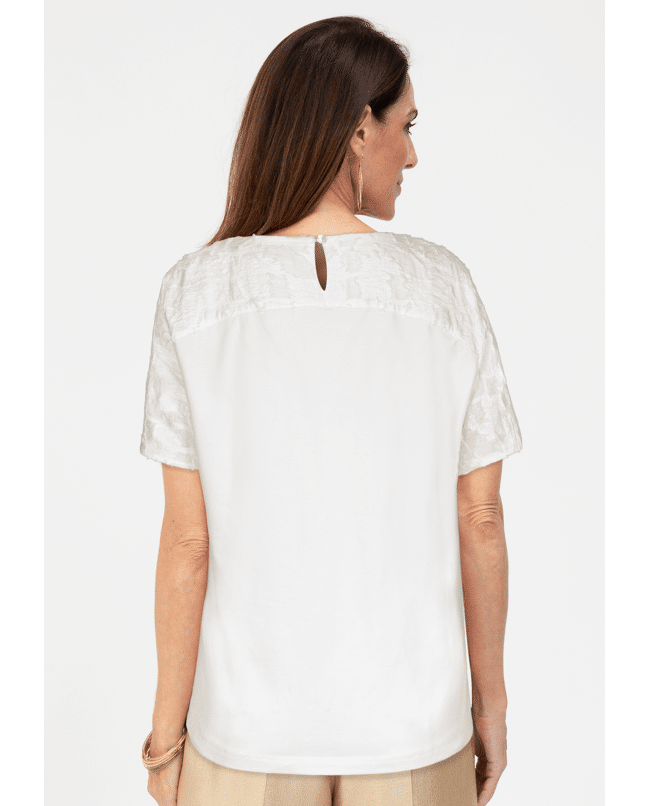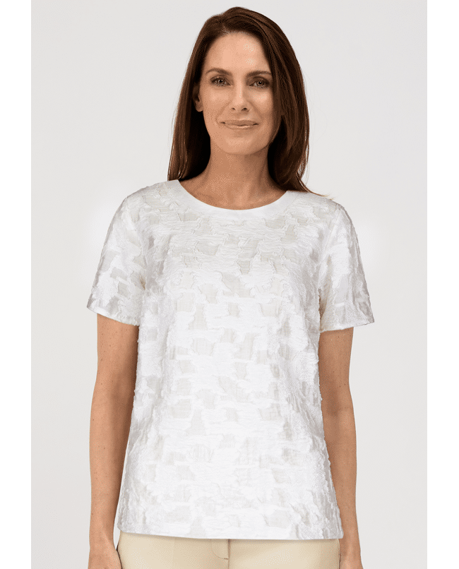 Het DARNI dames T-shirt van BIANCA is een verfijnde witte top met een subtiel abstract 3D-patroon. De rijke structuur geeft dit shirt net wat extra, terwijl de ronde hals en korte mouwen zorgen voor een tijdloze uitstraling. Mooi op een lichte broek of onder een blazer in het voorjaar en de zomer.
