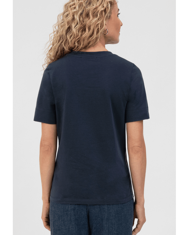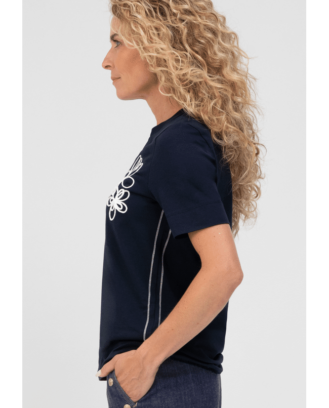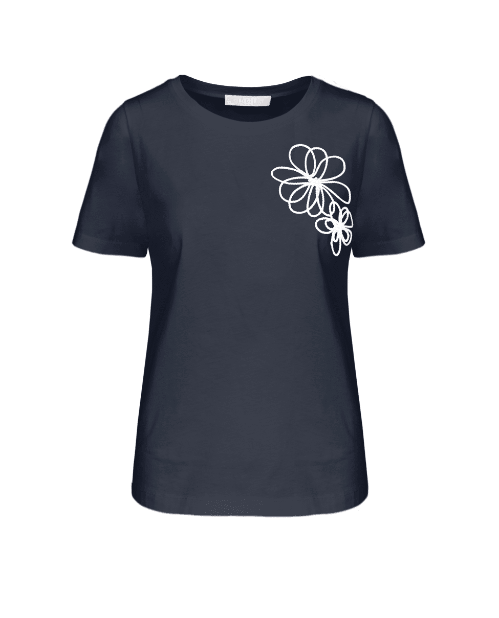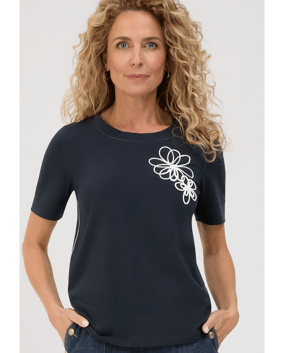 Een basic met een speelse twist: dit donkerblauwe T-shirt van Bianca is gemaakt van zacht katoen met stretch en heeft een subtiele bloemenapplicatie op de schouder. Perfect voor elke dag, met nét dat beetje extra.