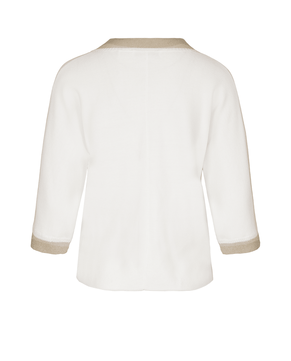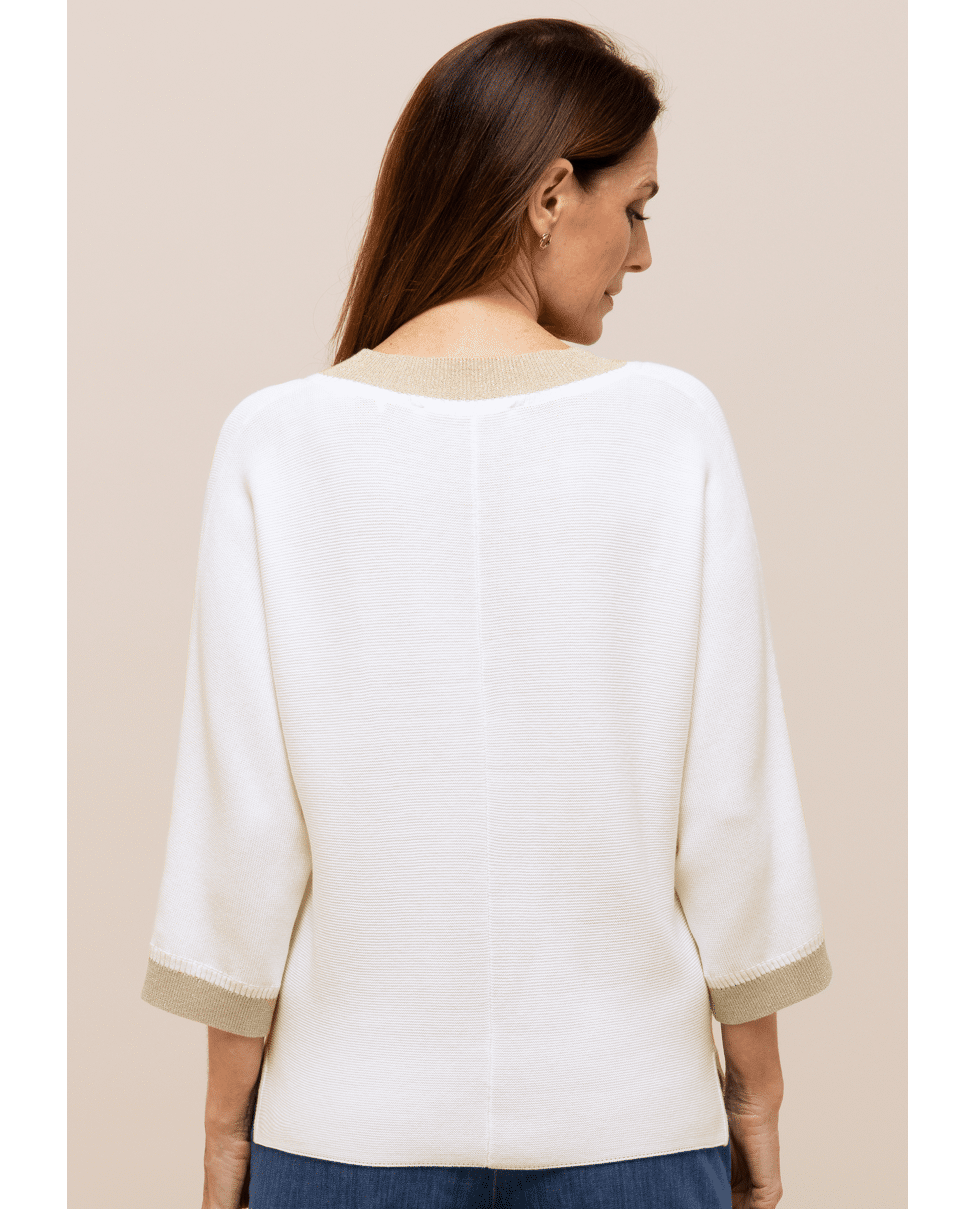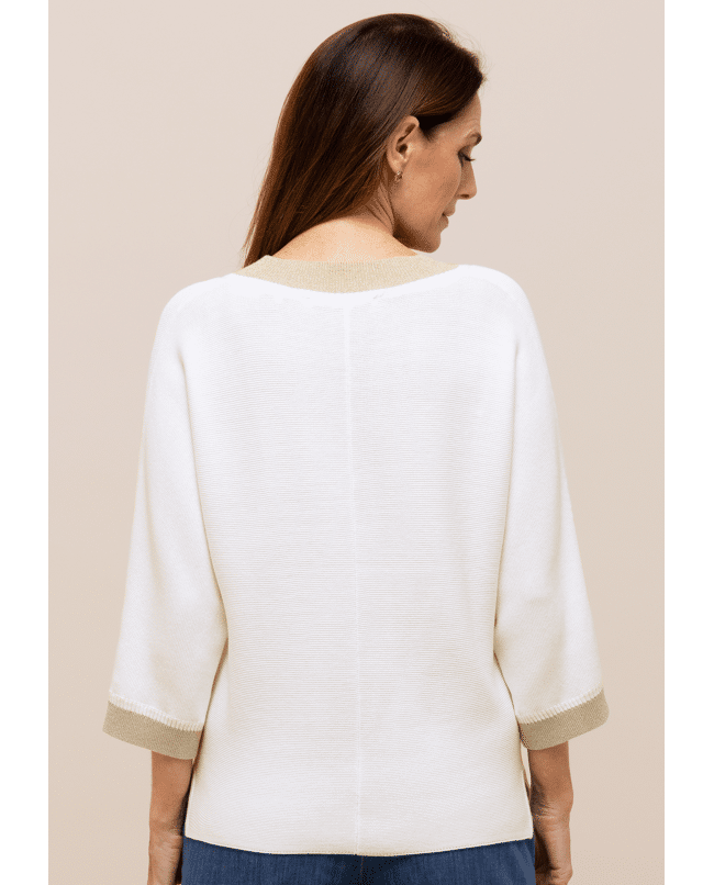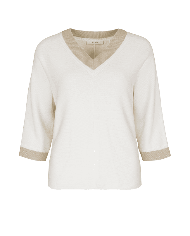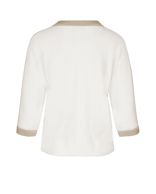 Deze fijngebreide trui van Bianca is een stijlvolle basic met een subtiel glinsterend accent. De combinatie van crème met goudkleurige boorden geeft je look net wat extra’s.