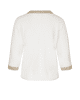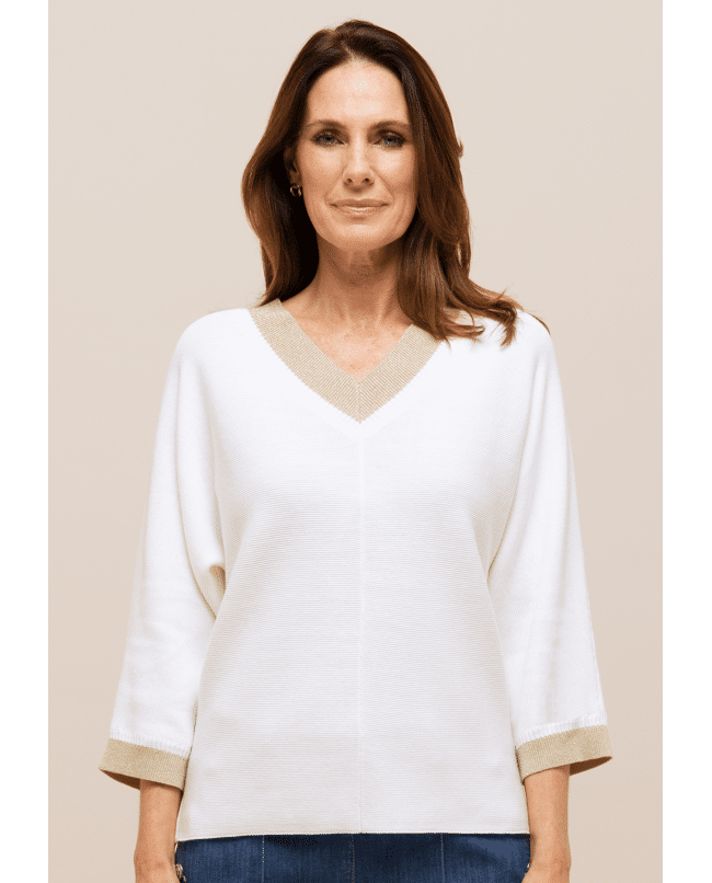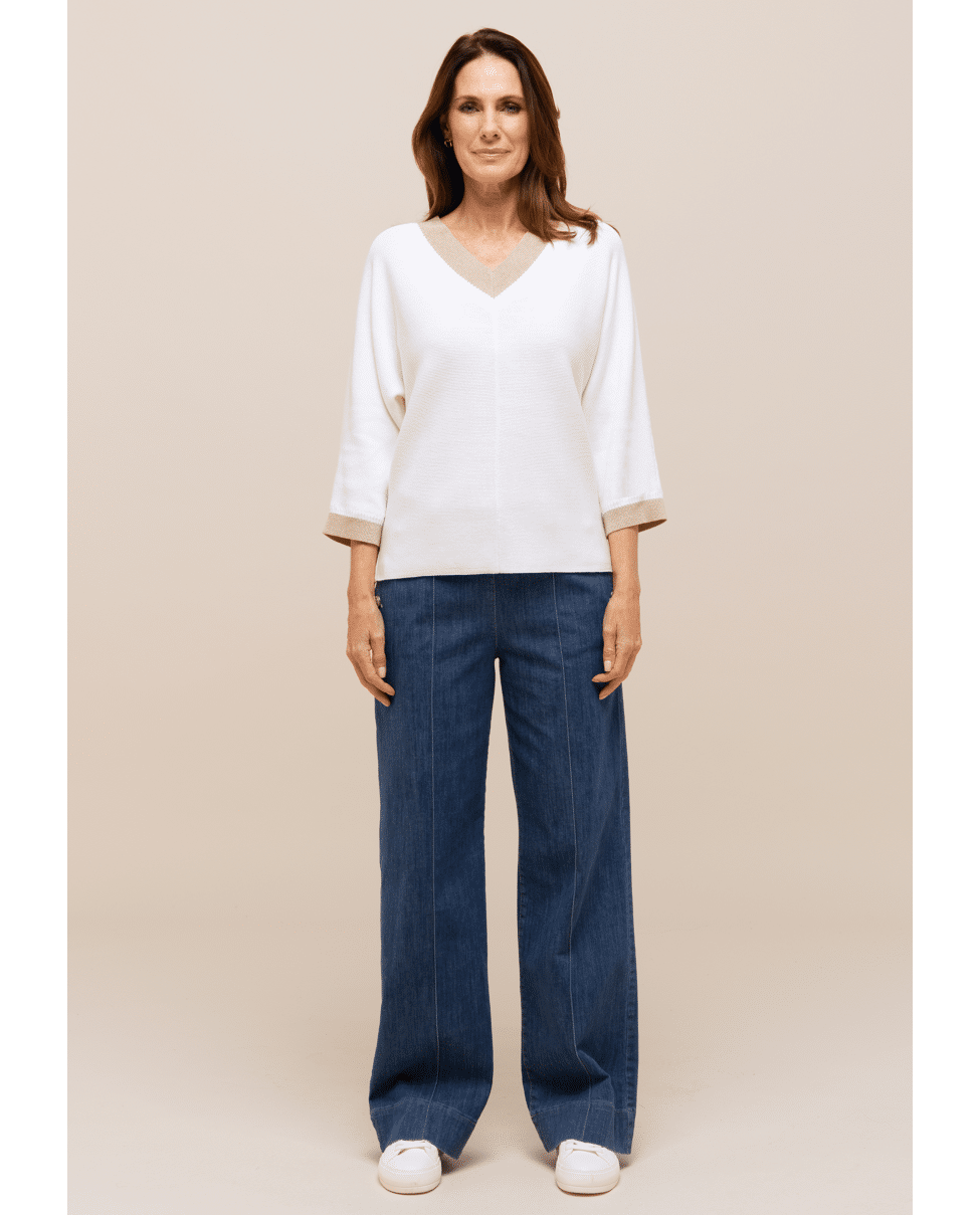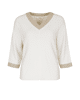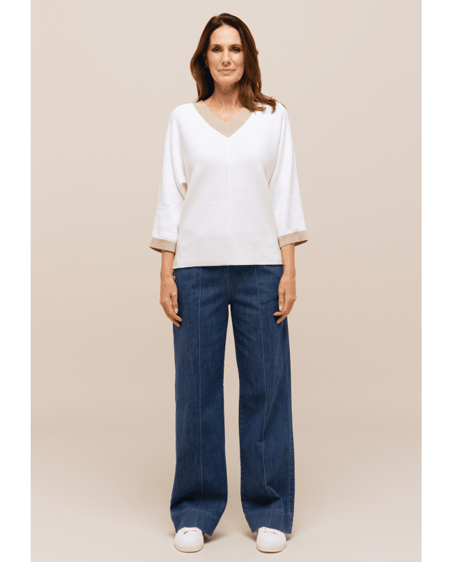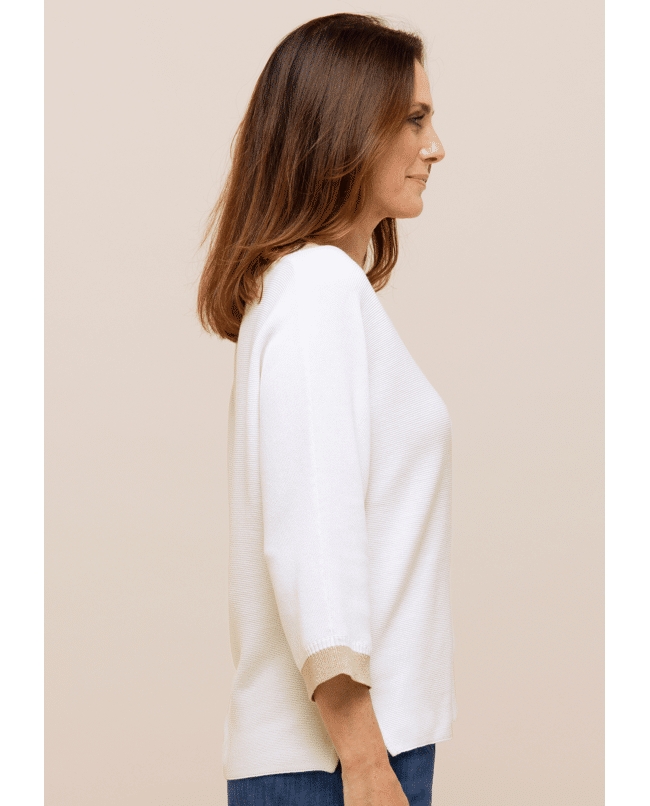 Deze fijngebreide trui van Bianca is een stijlvolle basic met een subtiel glinsterend accent. De combinatie van crème met goudkleurige boorden geeft je look net wat extra’s.