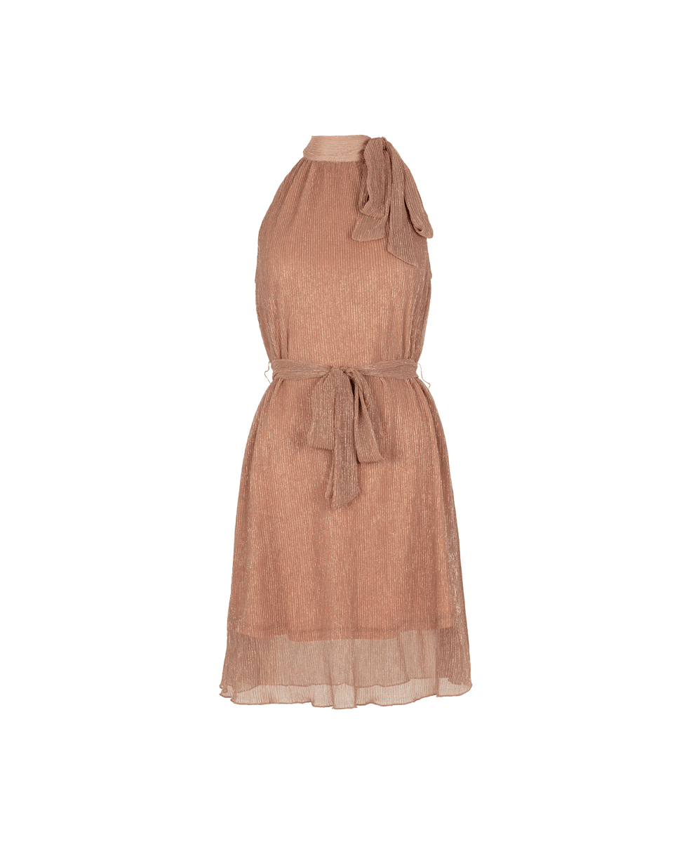 De Divya jurk van Freebird in copper is een sprankelende eyecatcher met een elegante, vrouwelijke uitstraling. De plissé lurex kwaliteit geeft de jurk een subtiele glitter en luxe glans, perfect voor feestelijke gelegenheden of een zomerse avond uit.