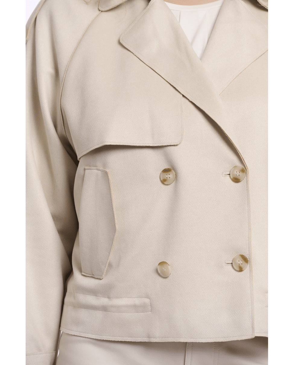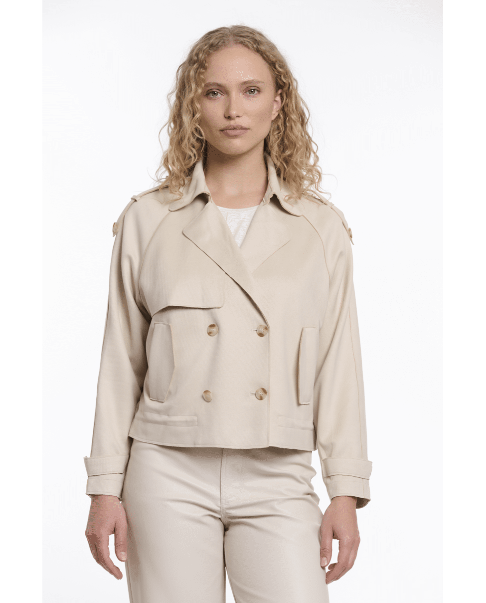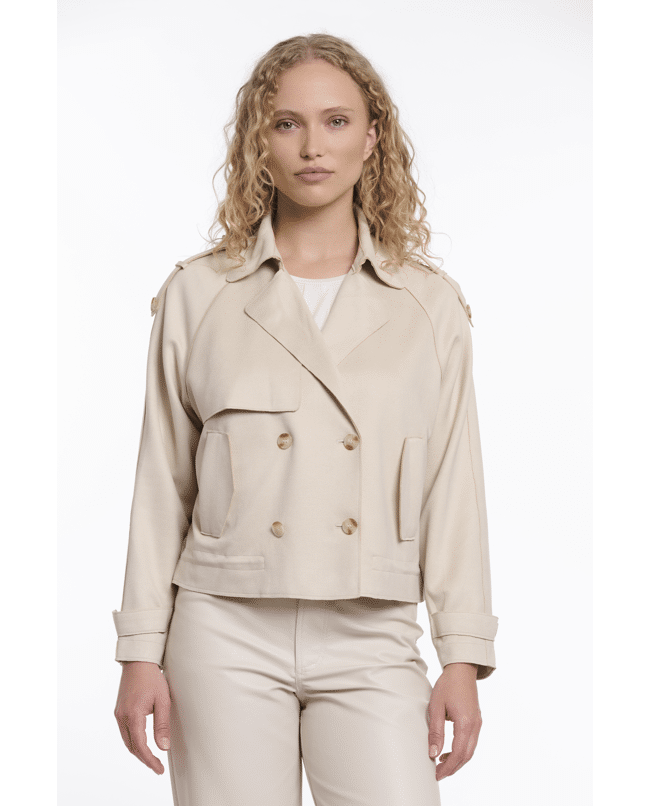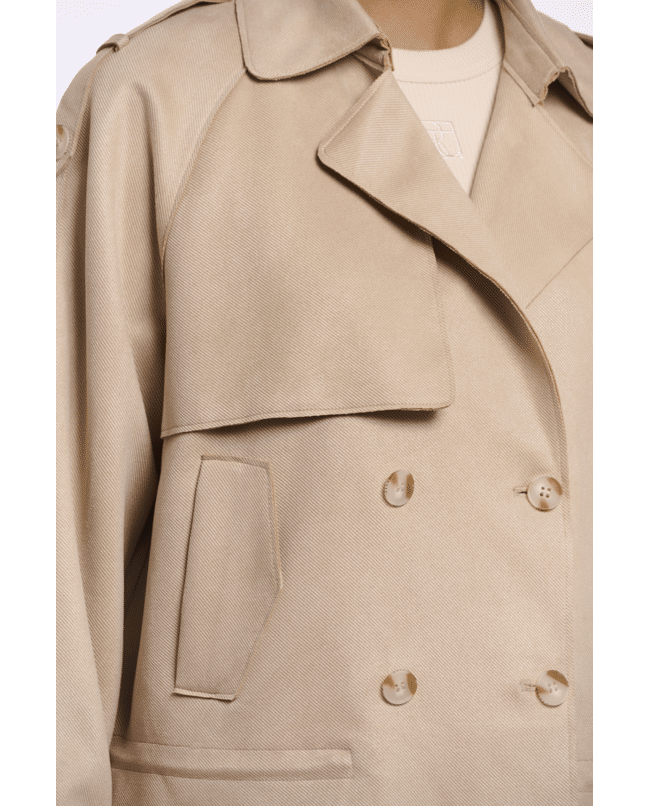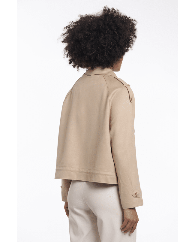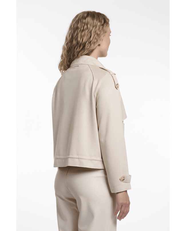 De combinatie van klassieke trenchdetails en een kort, modern silhouet maakt deze jas veelzijdig en eigentijds.