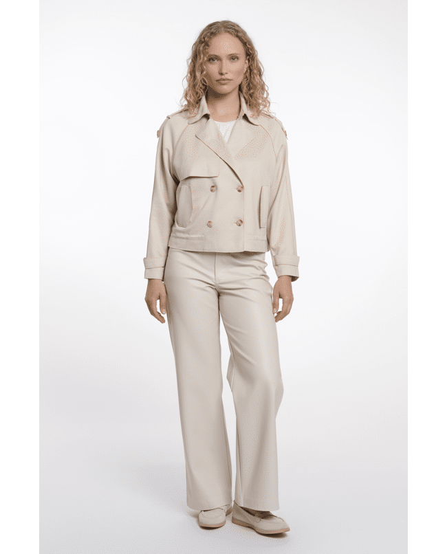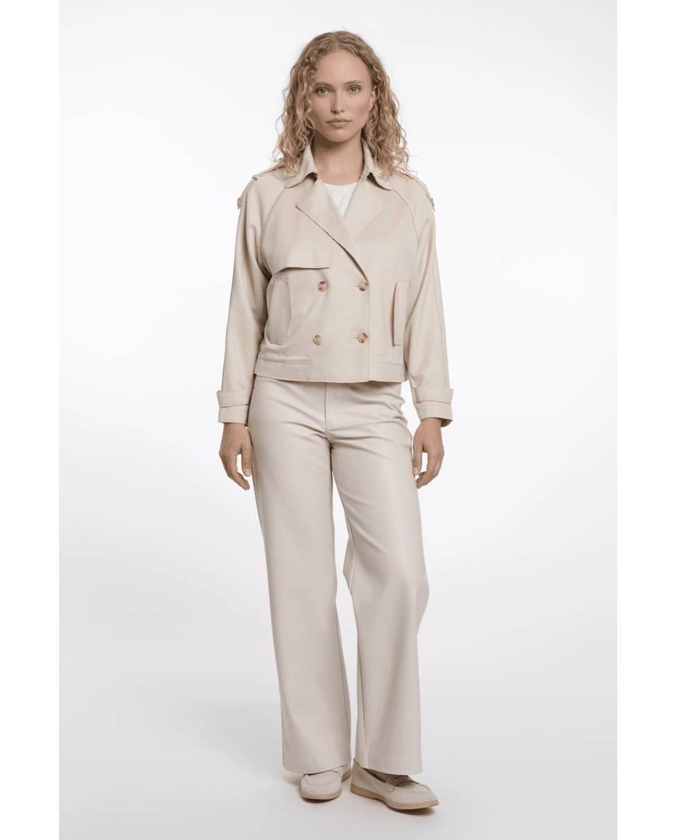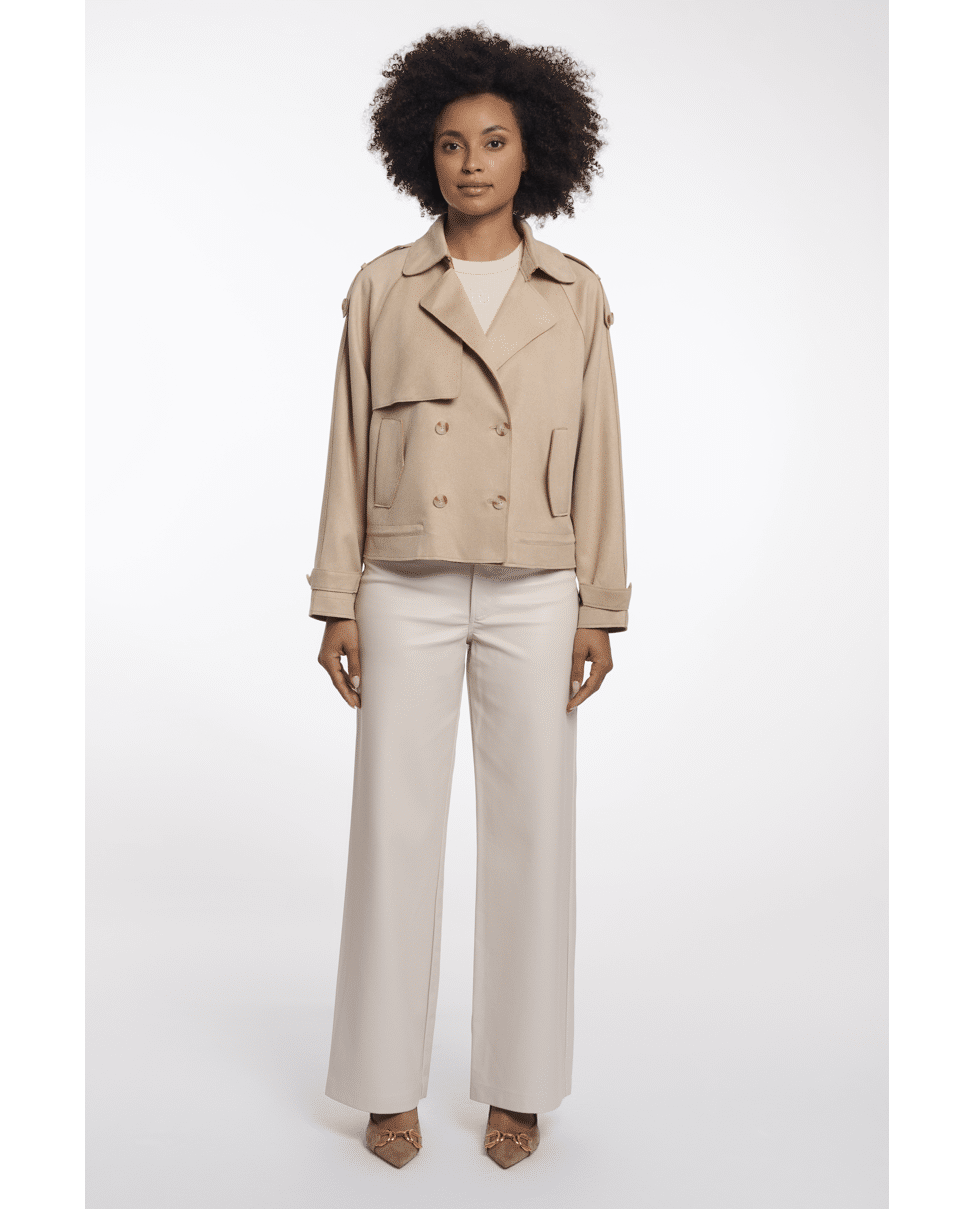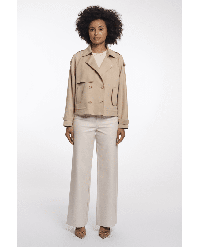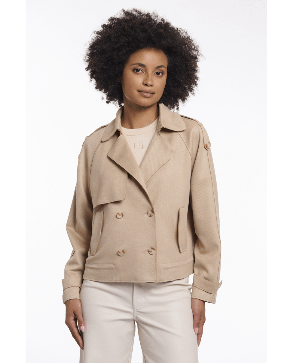 De combinatie van klassieke trenchdetails en een kort, modern silhouet maakt deze jas veelzijdig en eigentijds.