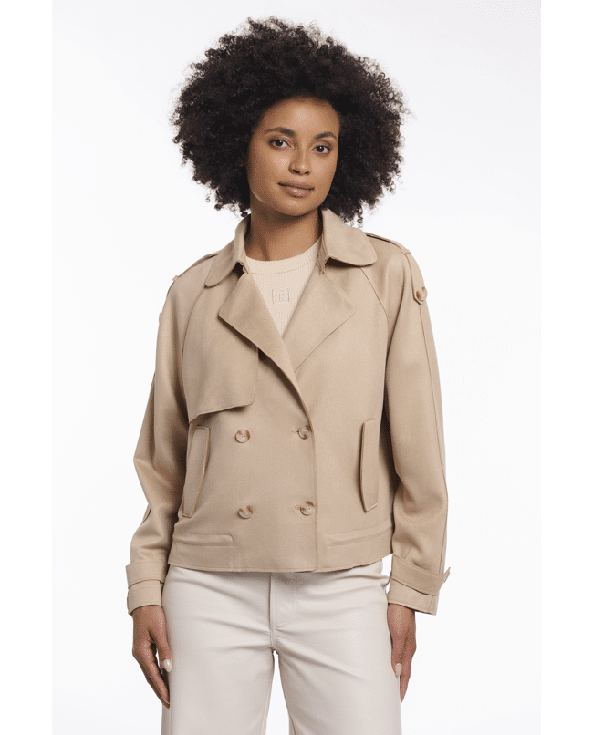 Deze korte trenchcoat in een zachte tint is een stijlvolle aanvulling op je voorjaarsgarderobe. De double breasted sluiting en schouderdetails geven een tijdloze, city chic uitstraling.