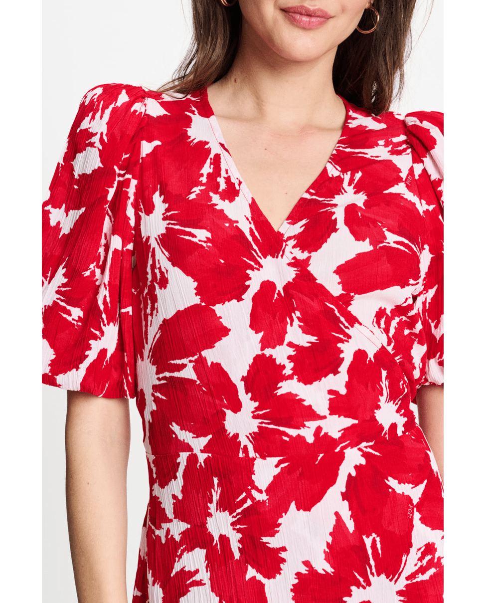 • Luchtige crinkle-stof met opvallende rode bloemprint