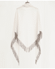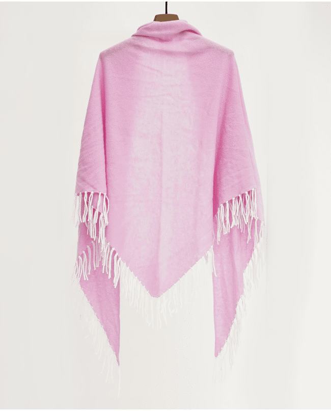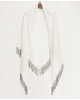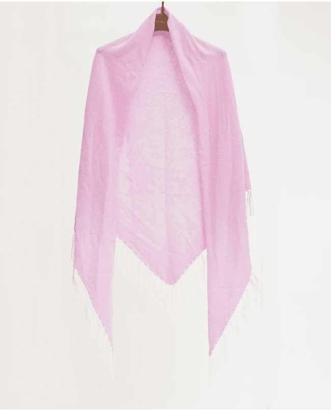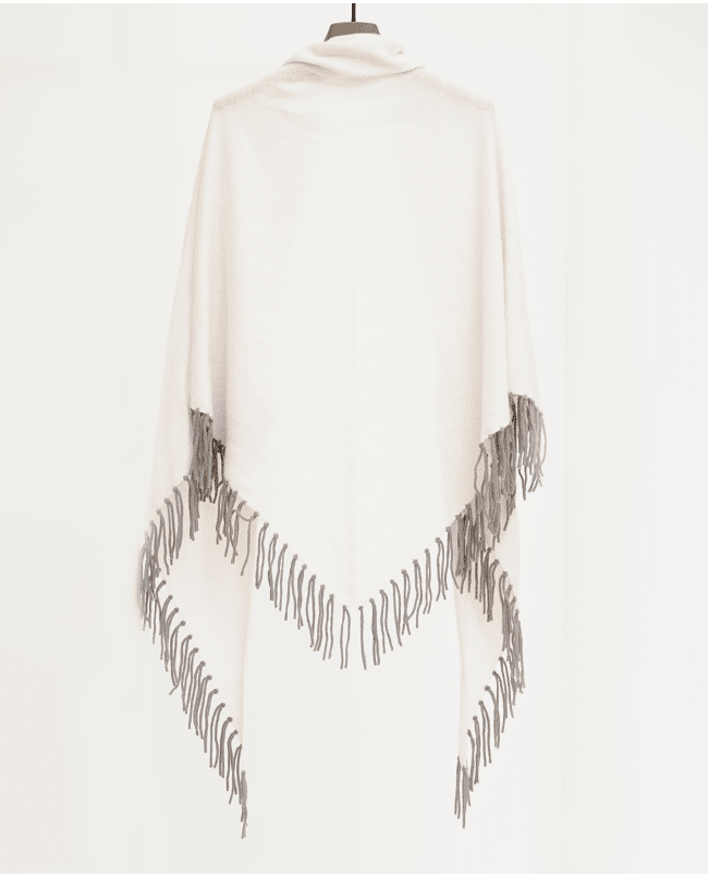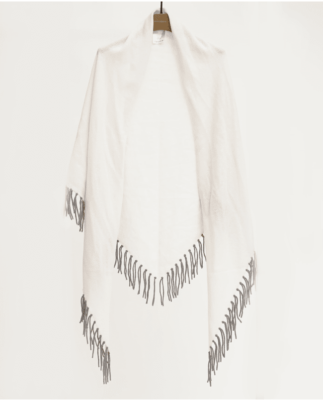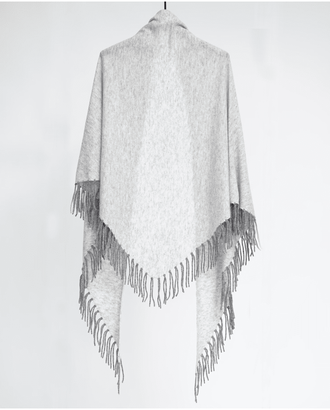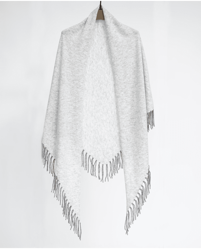 Een luxe driehoekige omslagdoek van zachte wol-kasjmiermix. De fijne franjes langs de randen en het royale formaat maken dit accessoire zowel stijlvol als behaaglijk. Perfect om over een jas of trui te dragen in het najaar.