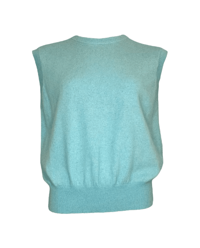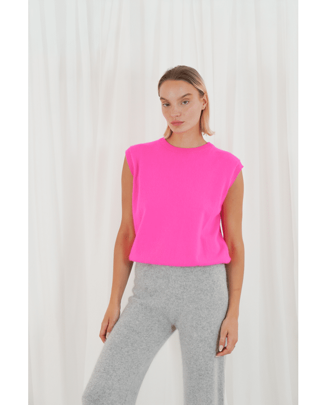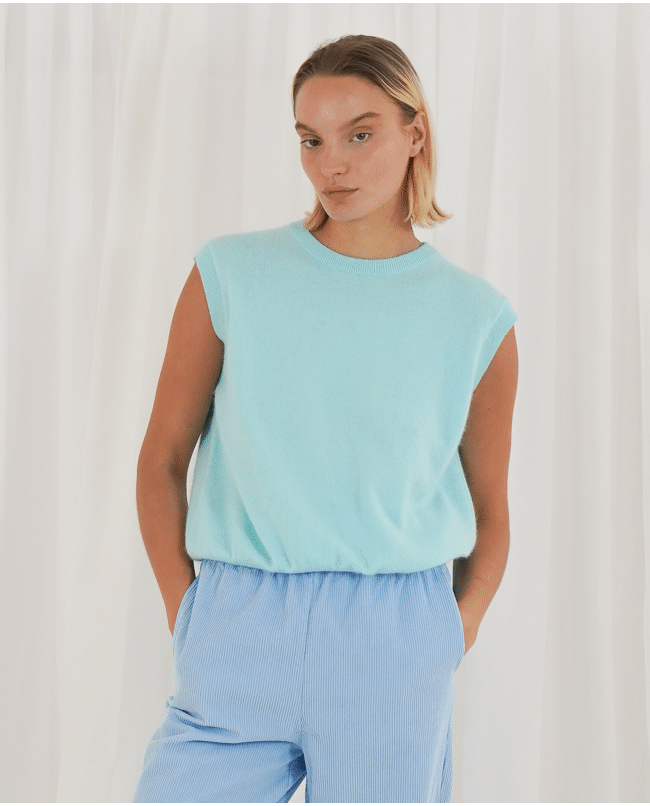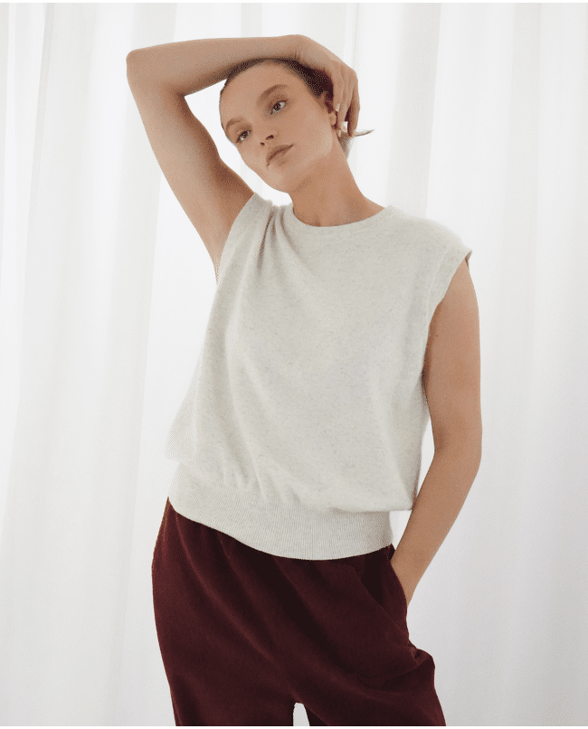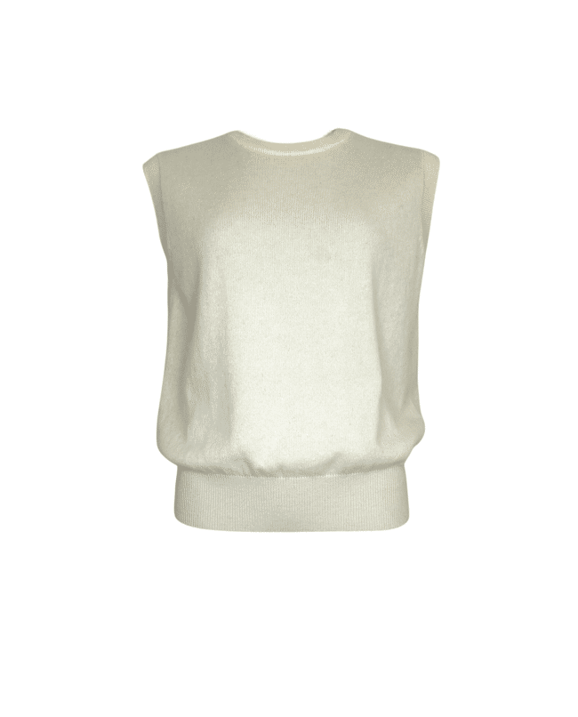 De mouwloze snit en neutrale stijl maken deze knit eindeloos combineerbaar – van stoer tot vrouwelijk.