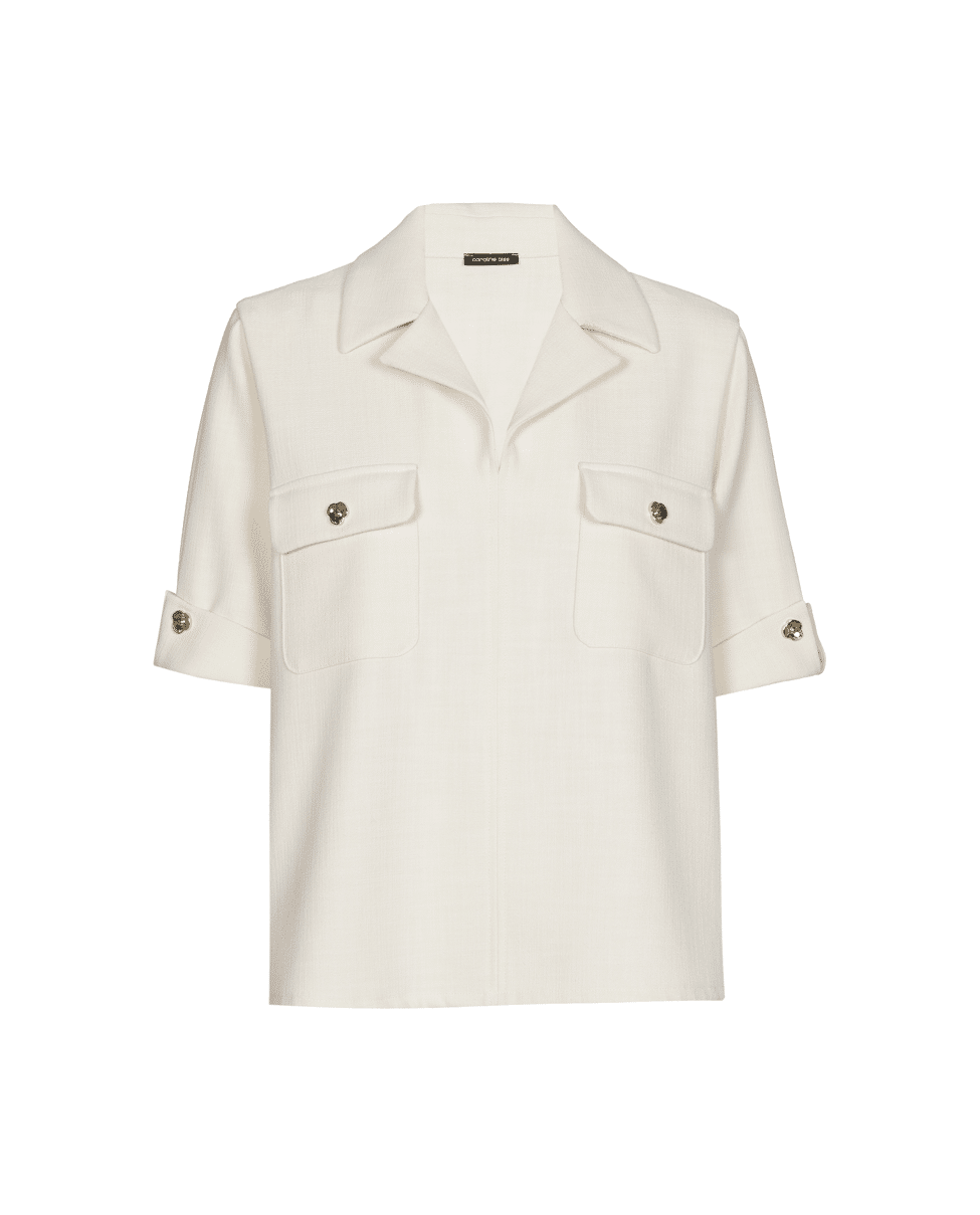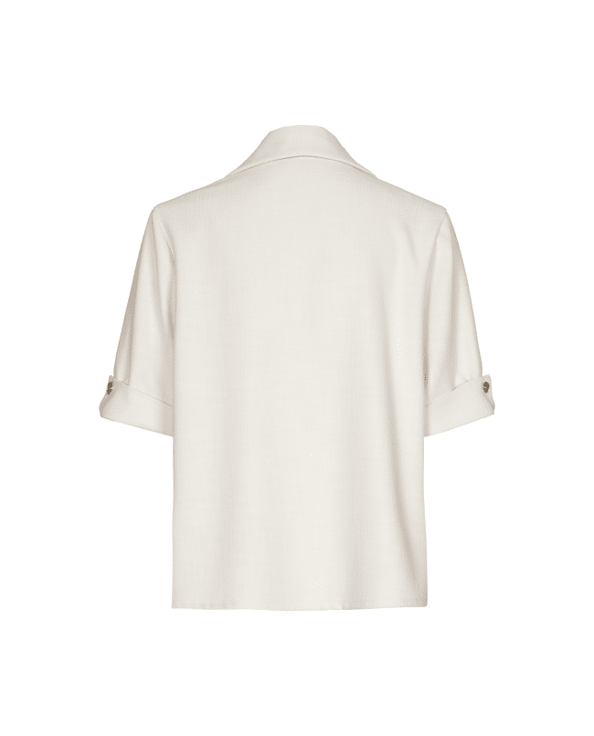 Deze tuniekblouse in een zachte naturel tint heeft een tijdloze uitstraling met utility-invloeden. De mix van structuur, knoopdetails en korte mouw geeft het geheel een moderne twist.