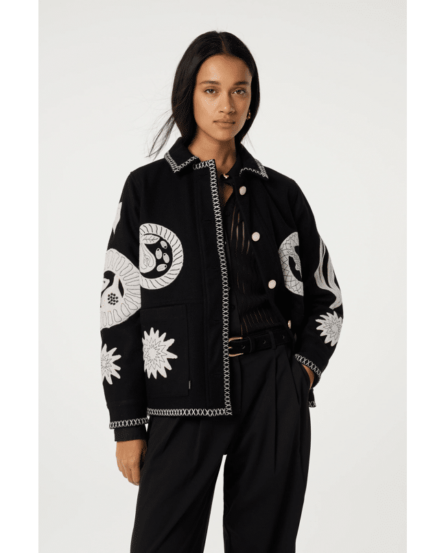 Elias Jacket – Damesjasje van Fabienne Chapot met opgestikte vruchten, vis, tulp en sterren, kraag, knoopsluiting, zakken en lange mouwen