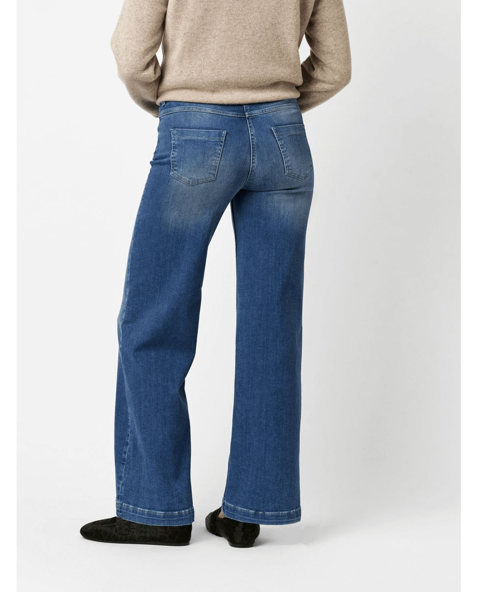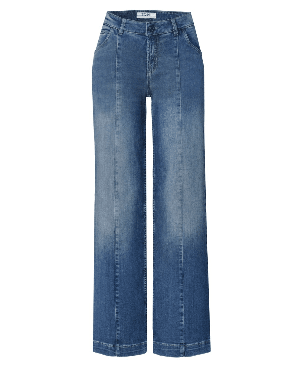 Ella Flared - Zachte damesjeans van Toni Dress met deelnaad midden voor op de pijpen, stekzakken, katoen-mix en riemlussen