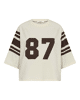 De brede mouwen, contrasterende strepen en het grote ‘87’-accent maken dit shirt tot een opvallend statement item.