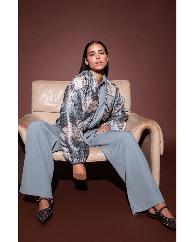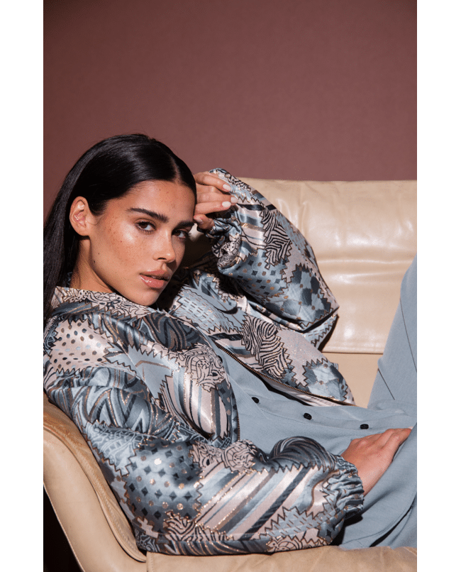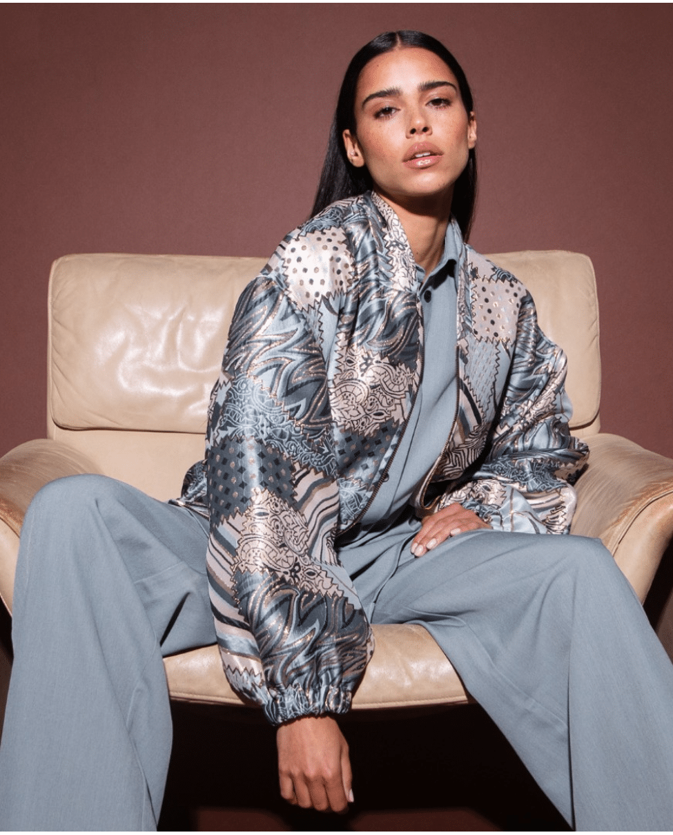 De unieke print en subtiele glans maken dit jasje een echte blikvanger – stijlvol én gedurfd.