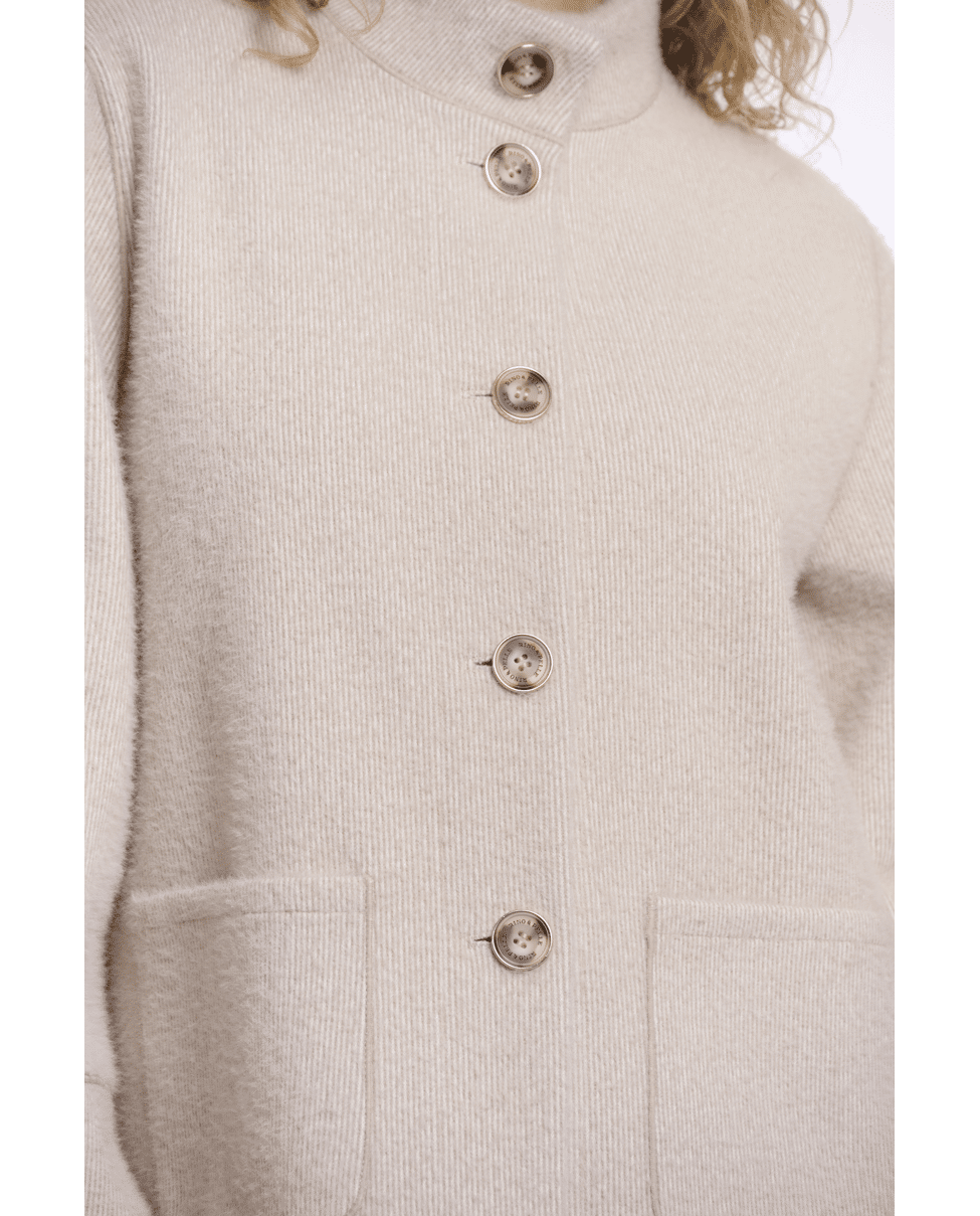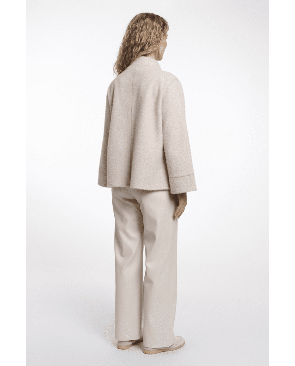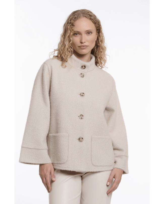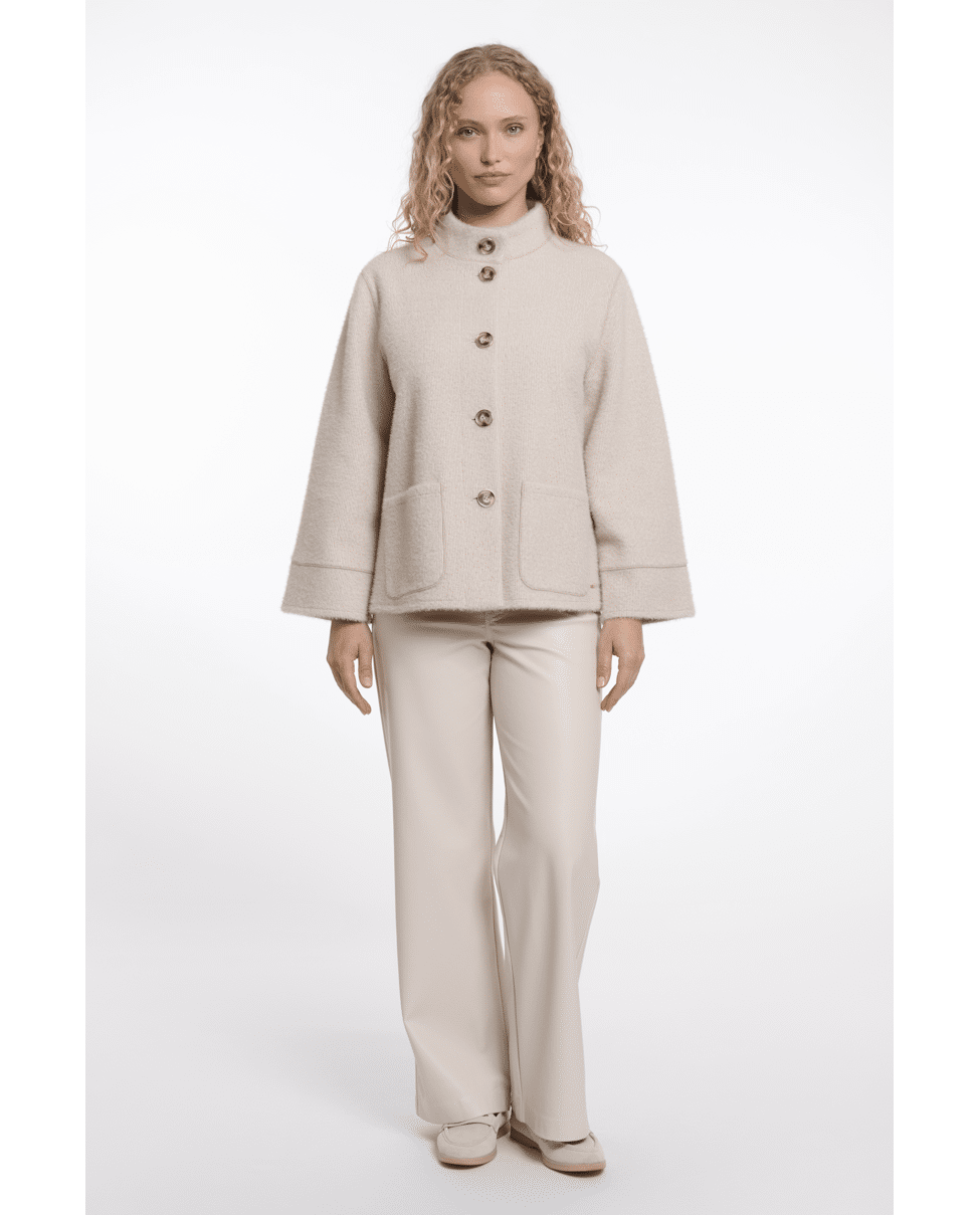 Deze cape coat in een zachte stone snow tint combineert het comfort van een vest met de uitstraling van een jas. Met opstaande kraag, knoopsluiting en ruime zakken is ze praktisch én vrouwelijk.