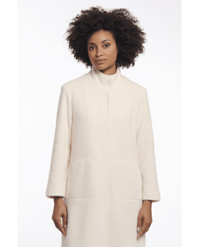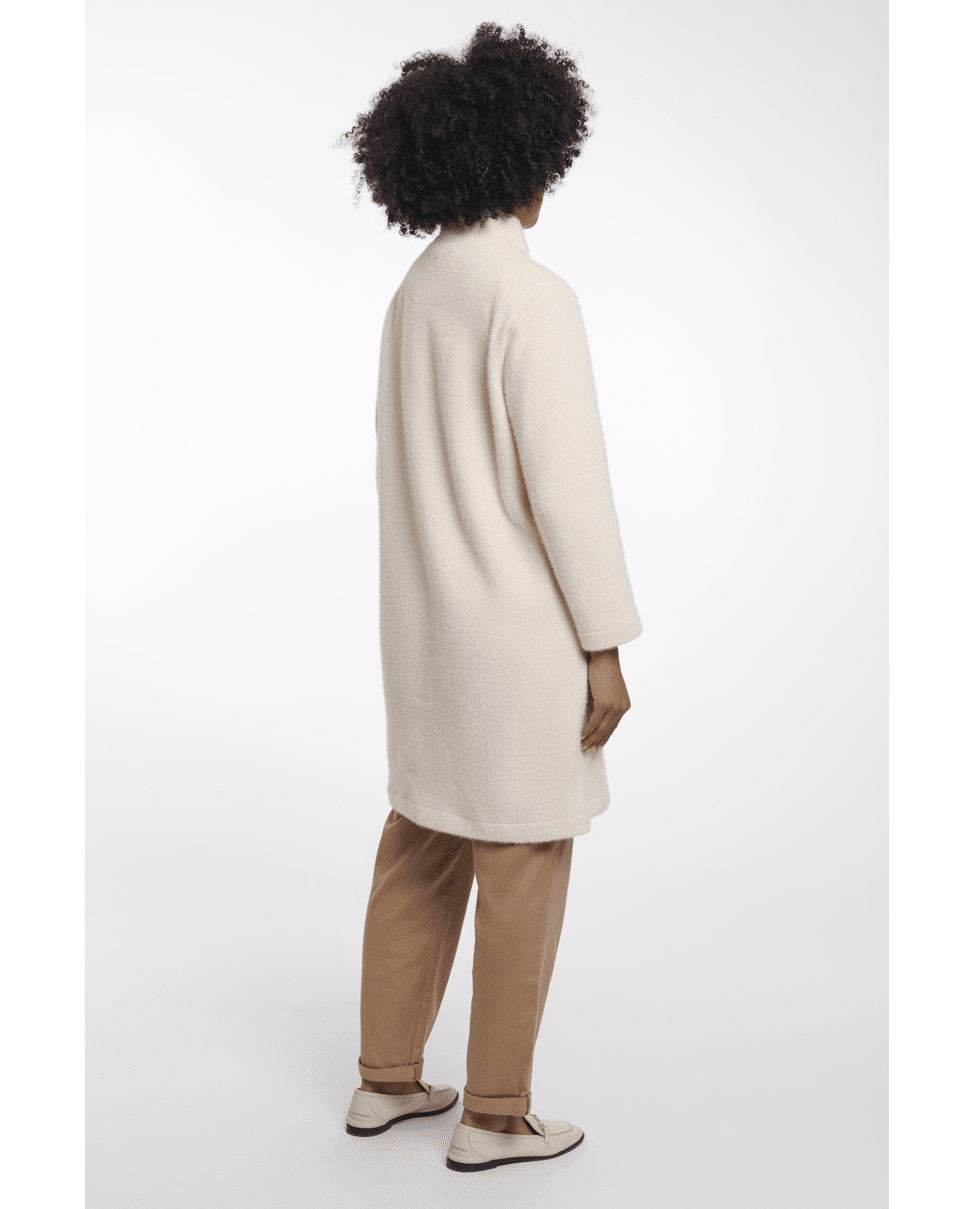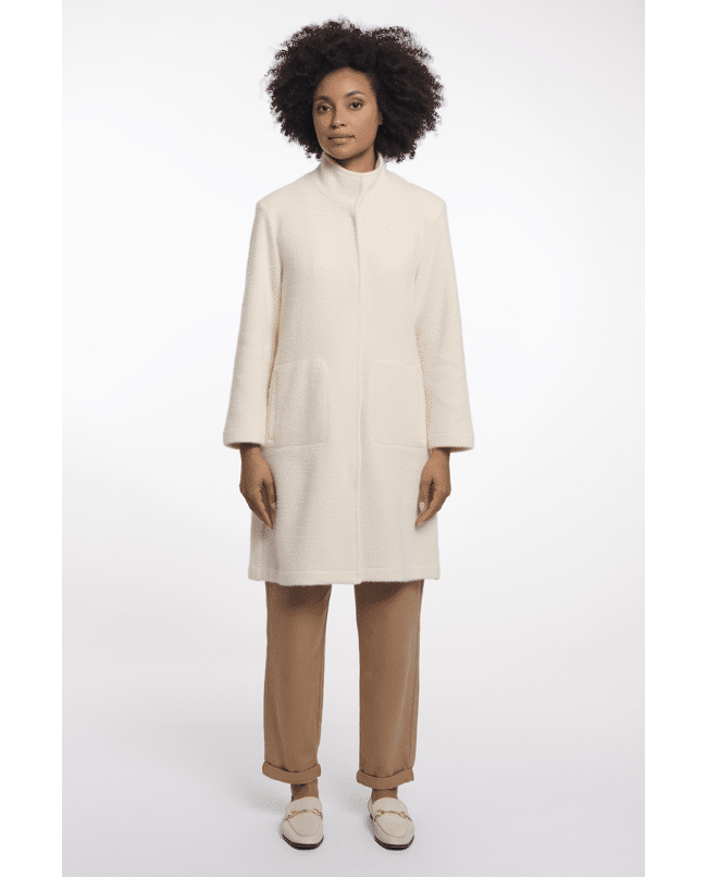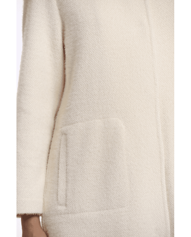 De minimalistische snit en structuurstof maken deze jas een subtiele blikvanger, elke dag weer.