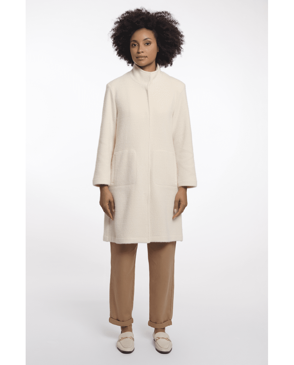 Deze lange jas in zachte birch-tint heeft een cleane look met moderne opstaande kraag. Licht en elegant – perfect voor gelaagde looks in het voorjaar.