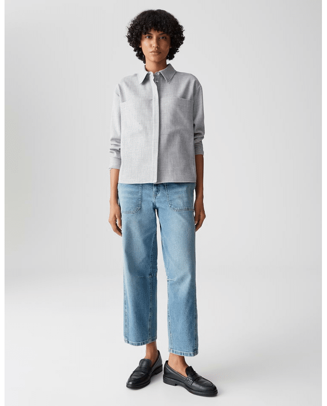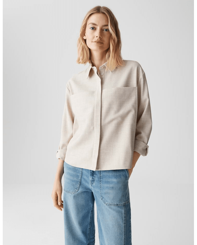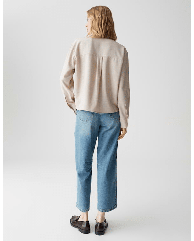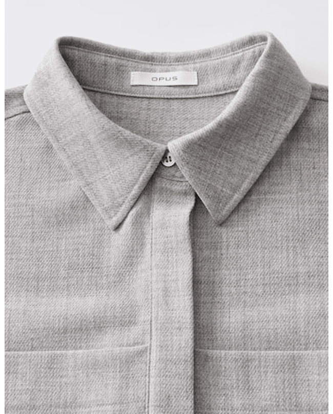 Een moderne overhemdblouse met boxy fit en melangelook. De opgestikte zakken en subtiele keperstructuur geven deze blouse een stoer accent – perfect voor een eigentijdse jeanslook.