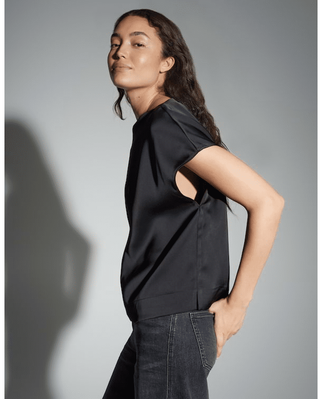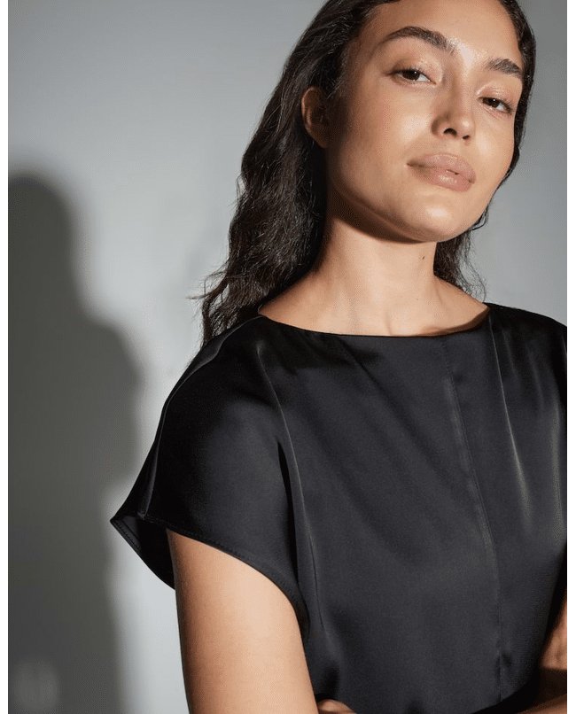 Deze satijnen top van OPUS combineert moeiteloze elegantie met draagcomfort. De vloeiende stof, rechte snit en subtiele glans maken dit een verfijnd item voor feestelijke gelegenheden of stijlvolle werkdagen.