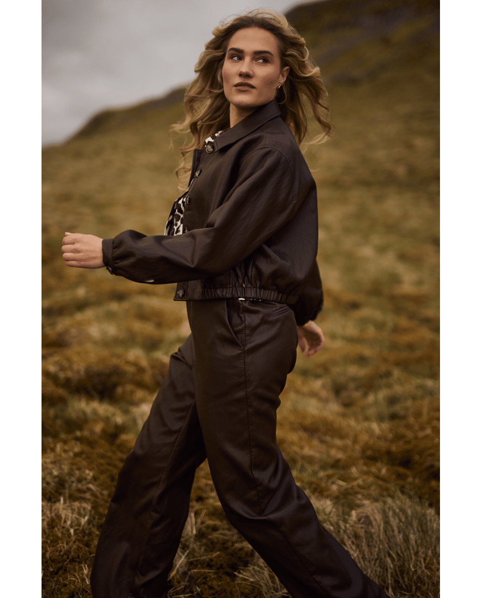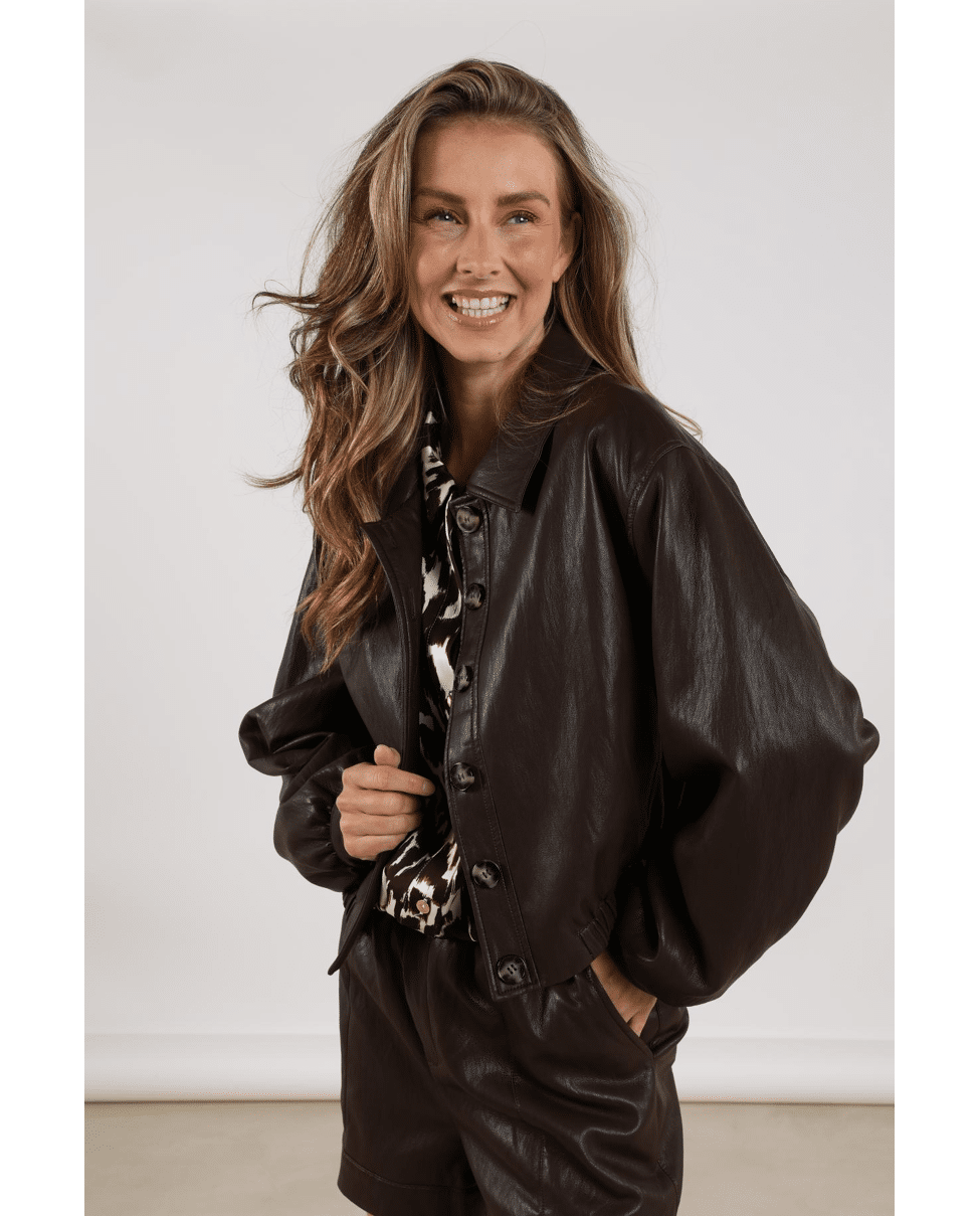 Het Fiene jacket is een stoer en stijlvol leerlook jasje dat elke outfit direct een edgy touch geeft. Dit veelzijdige item combineert moeiteloos comfort met een moderne look.