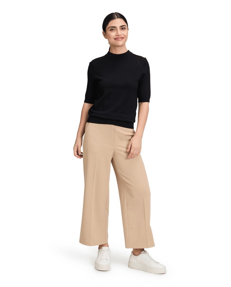Deze gebreide trui is een tijdloze basic met een vrouwelijke twist. Met halflange mouwen en een opstaande kraag geeft hij je look een verzorgde, moderne uitstraling. Ideaal voor vrouwen die een zachte knit zoeken die makkelijk te combineren is.