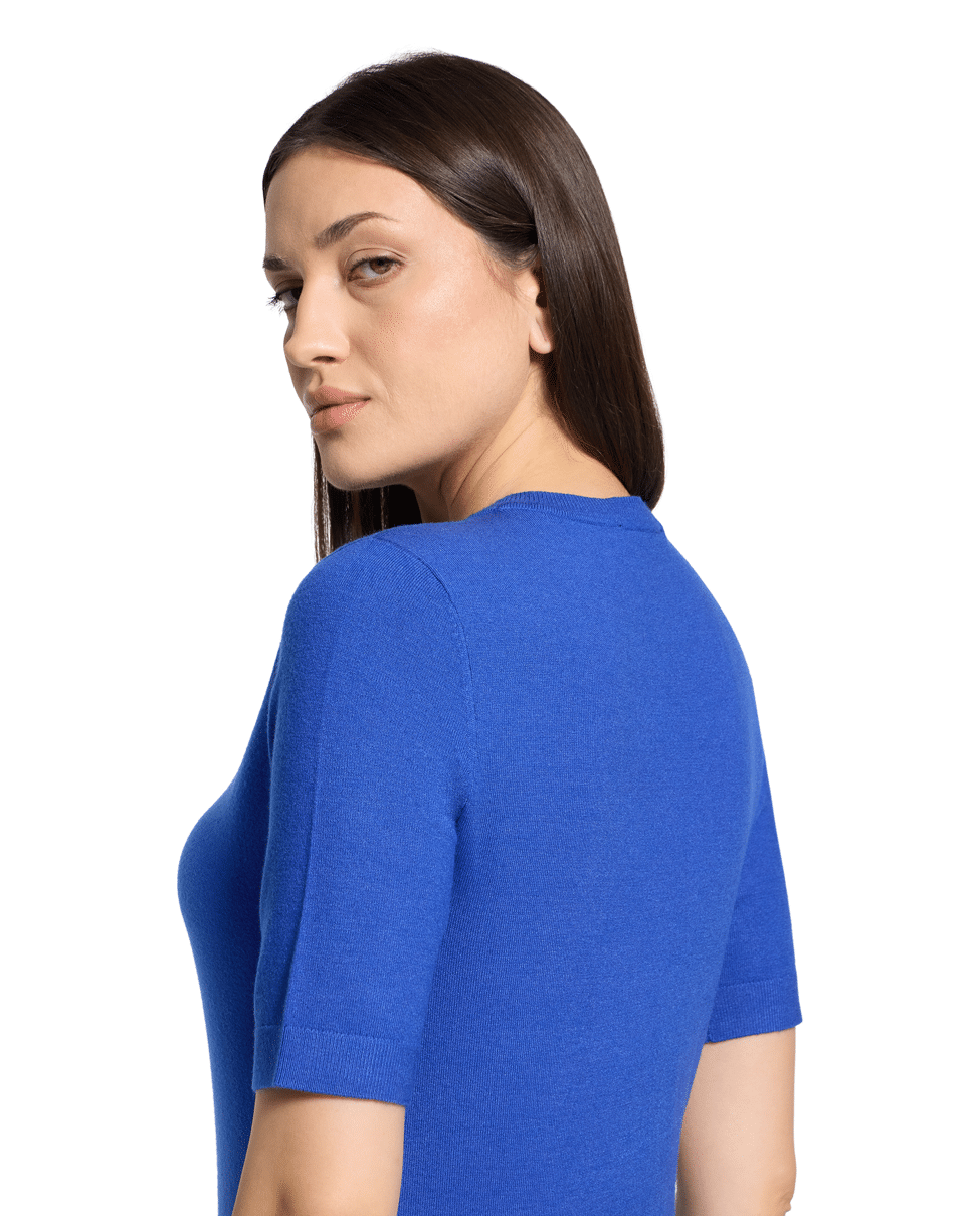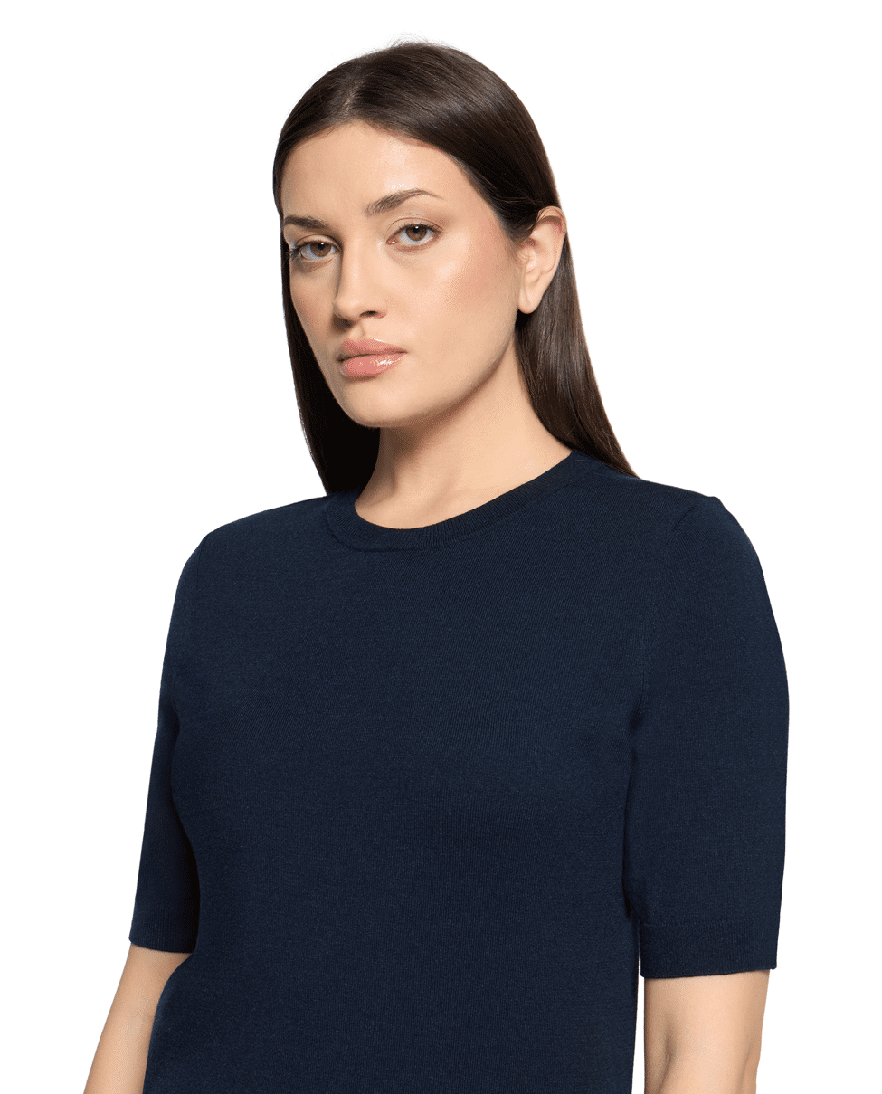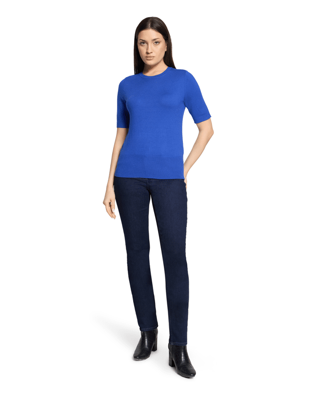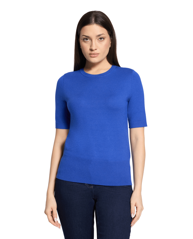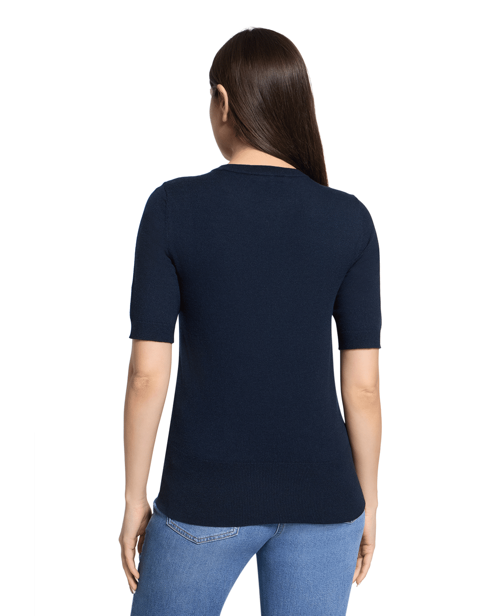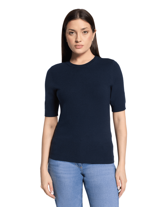 Deze fijngebreide trui met korte mouwen is een stijlvolle basic voor het voorjaar. Perfect onder een blazer of solo op een lichte jeans.