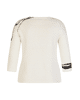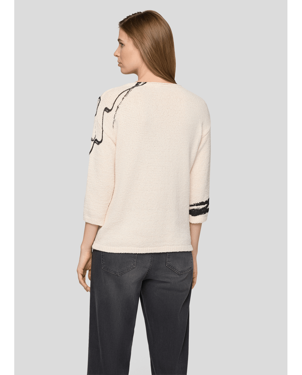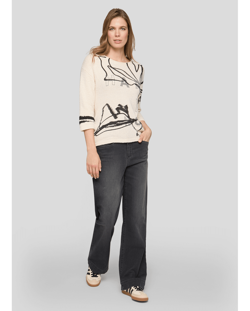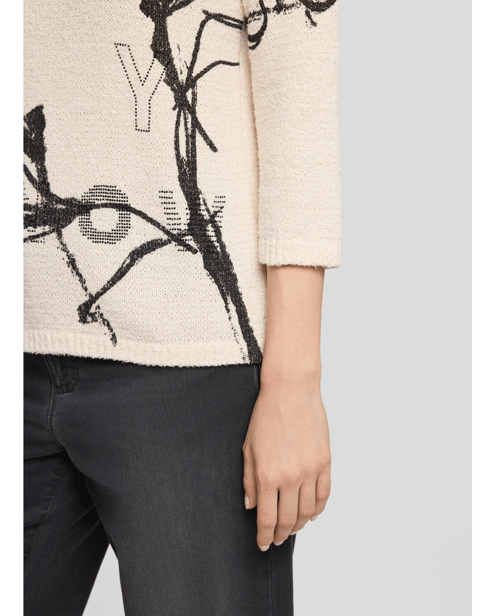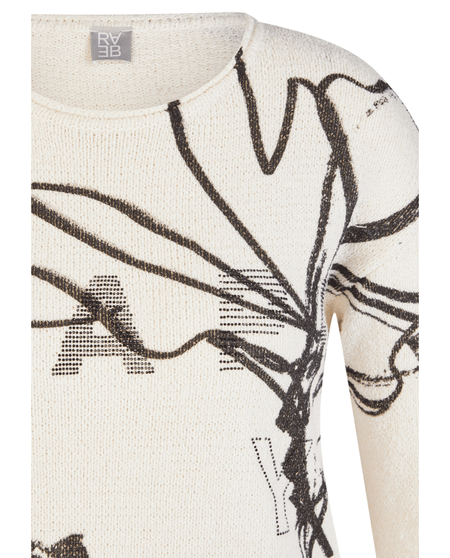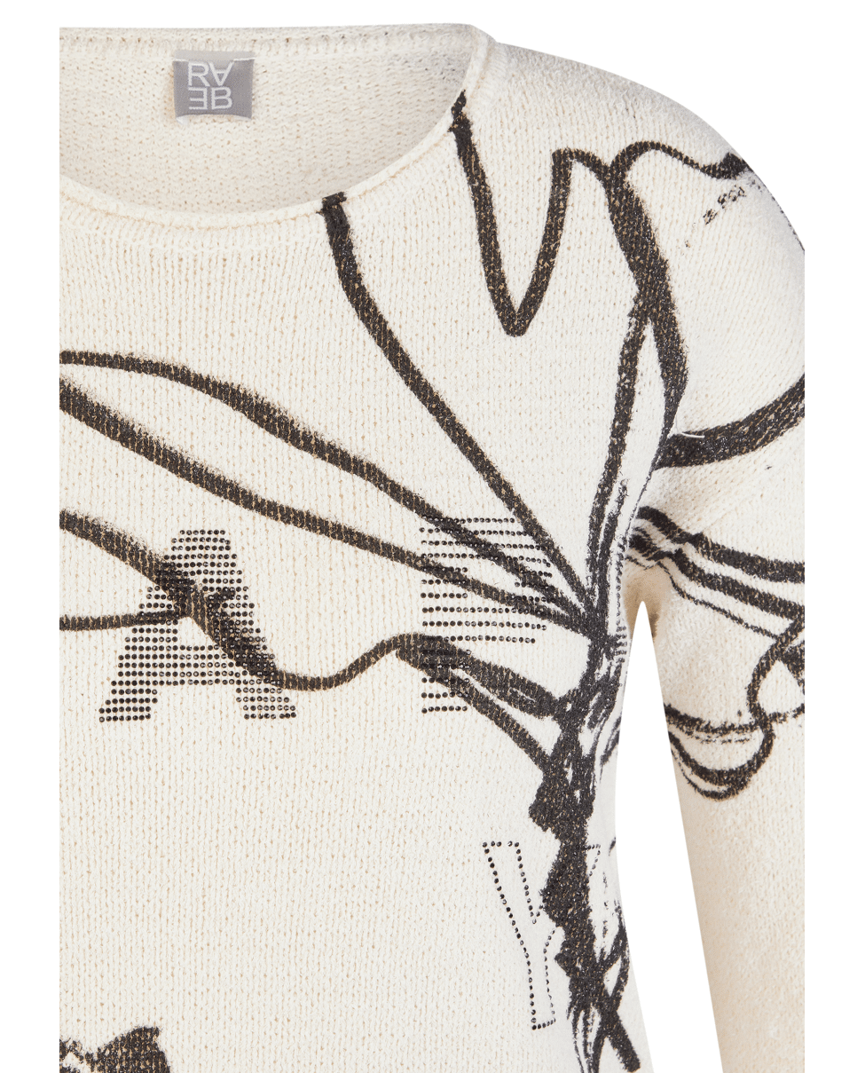 Fijn gebreide damestrui van Rabe met artistieke print, strassteentjes, ronde halslijn en 3/4 mouwen