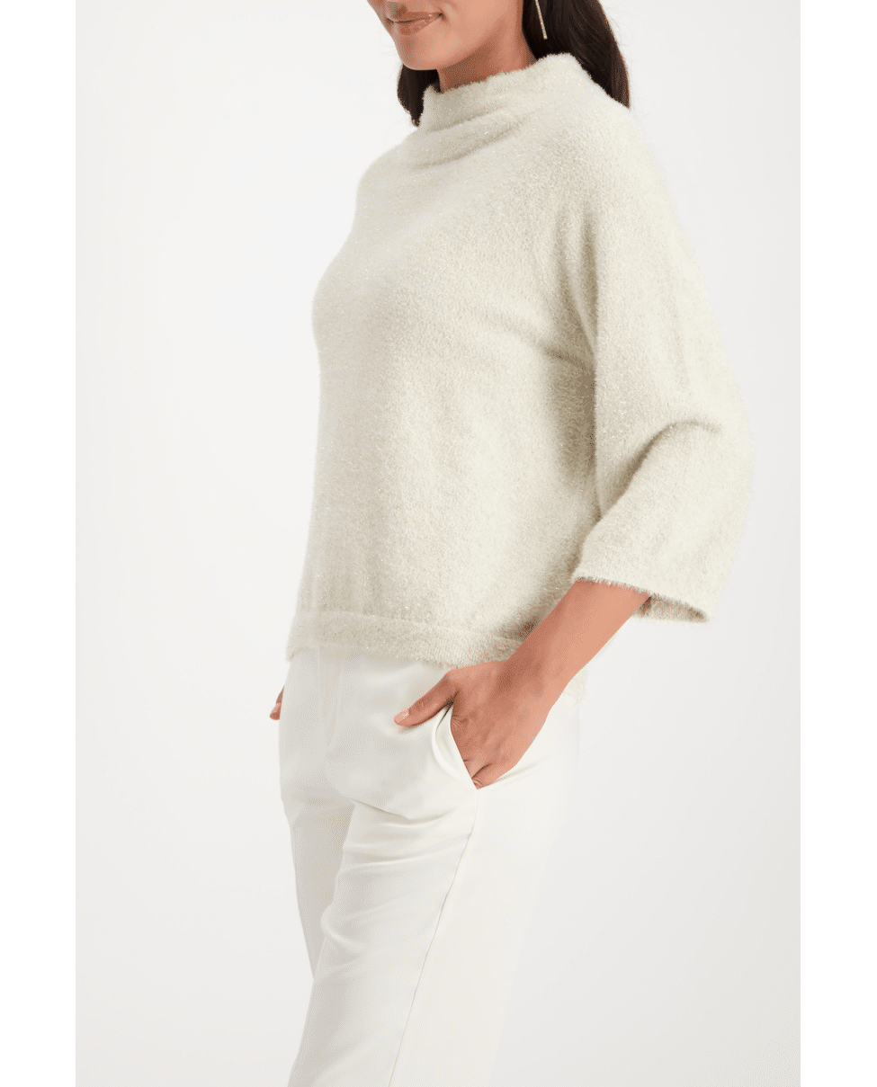 Zachte fluffy trui in een warme tint met subtiele Lurex-glans. Perfect voor cozy dagen en moeiteloos stijlvol bij elke outfit.