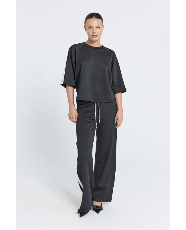 De wijde mouwen en de zachte stretchstof maken dit item nonchalant en eigentijds. De contrasterende bies voegt net dat beetje extra toe.