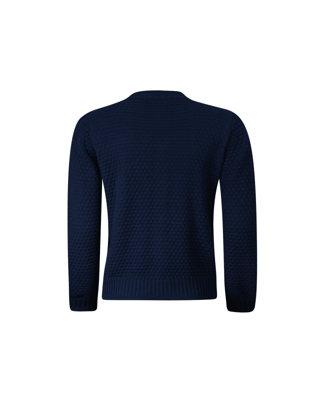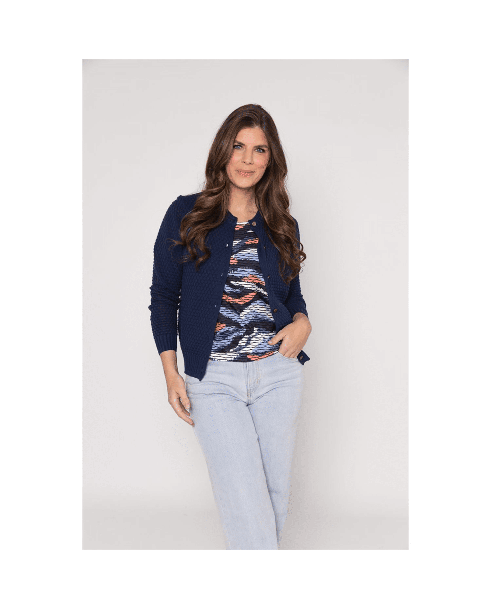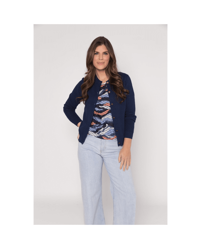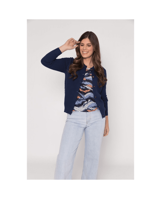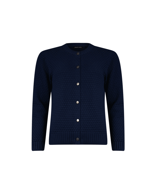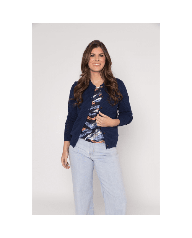 Dit navy dames vest met ronde hals is een tijdloze toevoeging aan je garderobe. De fijne fancy steek en diepe blauwe kleur geven het vest een verzorgde uitstraling – ideaal als extra laagje op frisse lentedagen of zomeravonden.