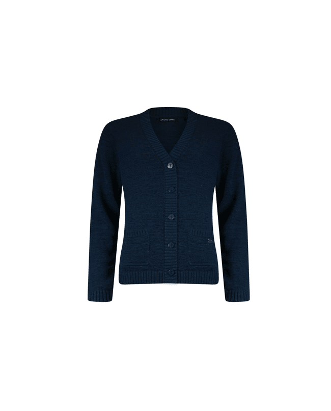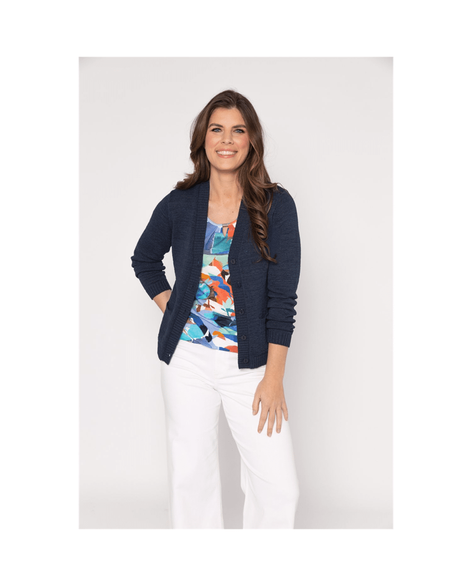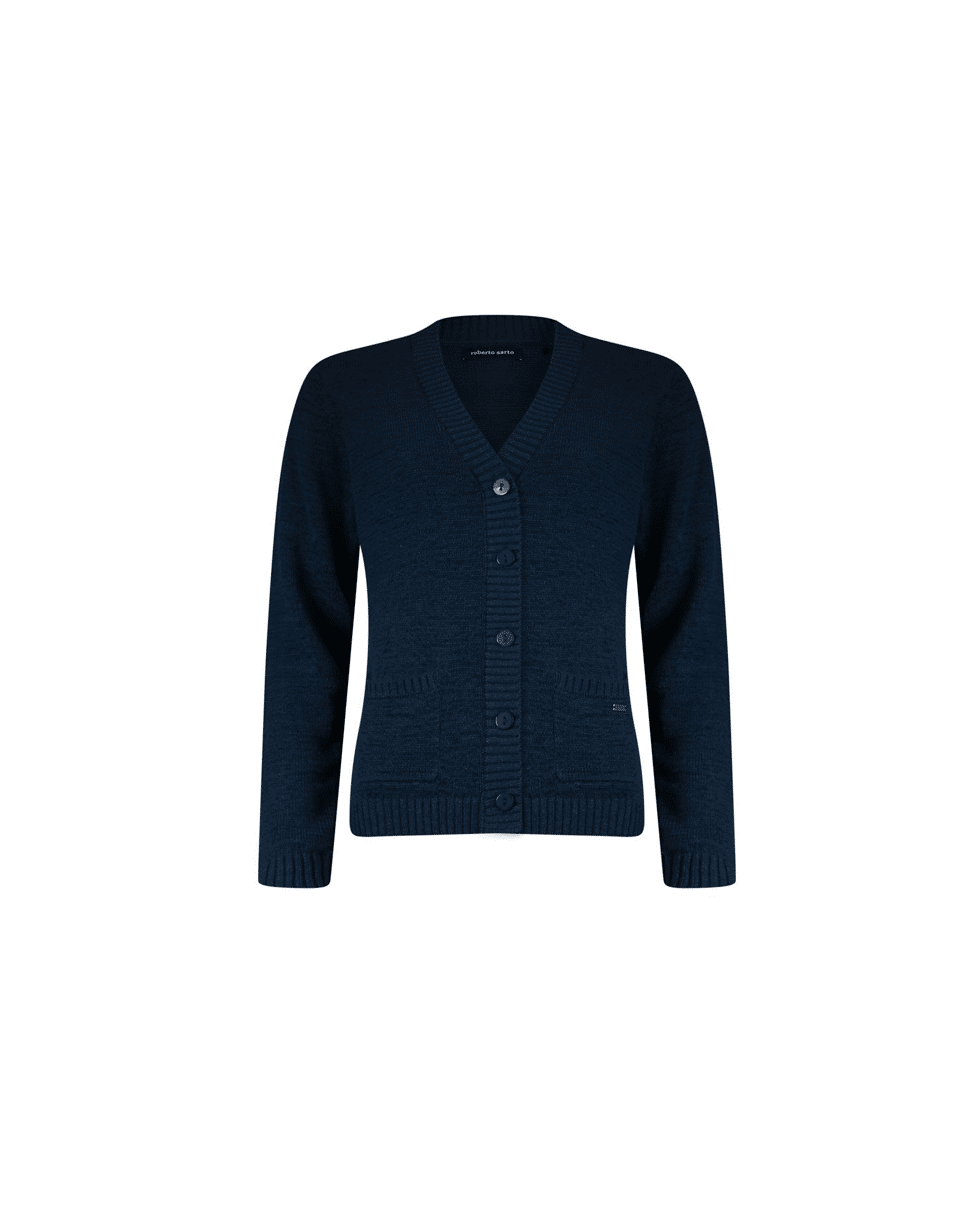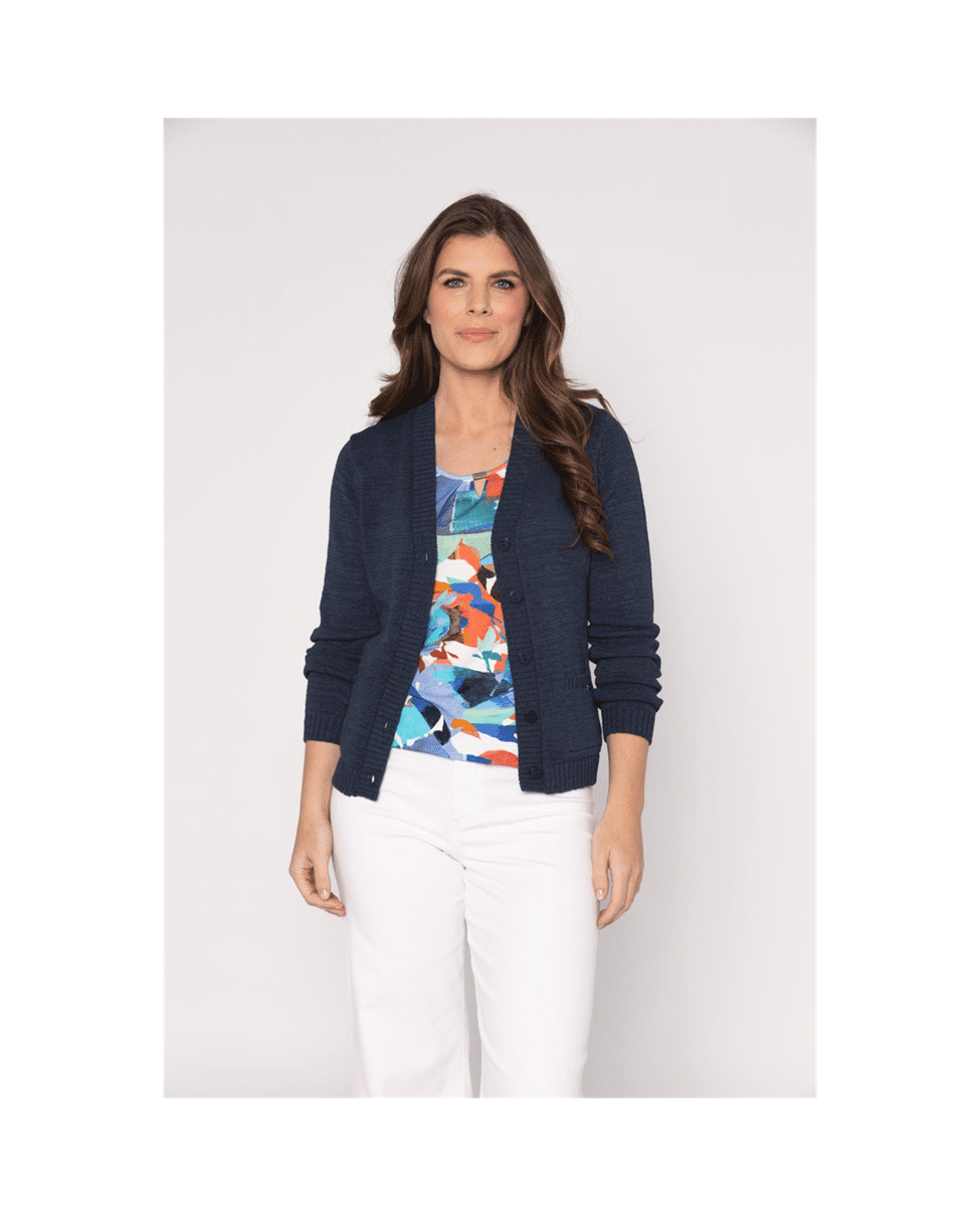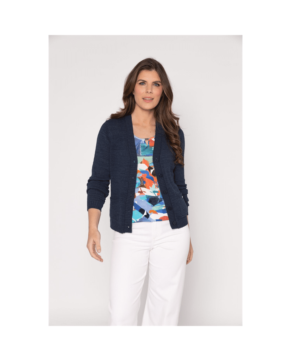 Kort gebreid damesvest met V-hals van Roberto Sarto in tijdloos navy. Dit voorjaarsvest met knoopsluiting en zakjes combineer je moeiteloos over een top of blouse. Een fijne basic die je outfit net wat meer gelaagdheid geeft.