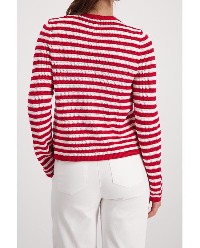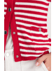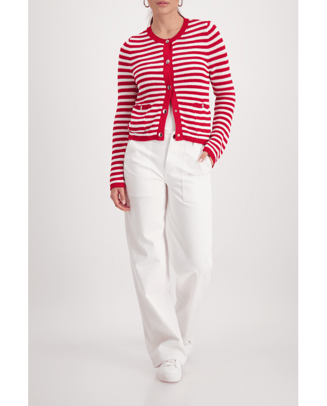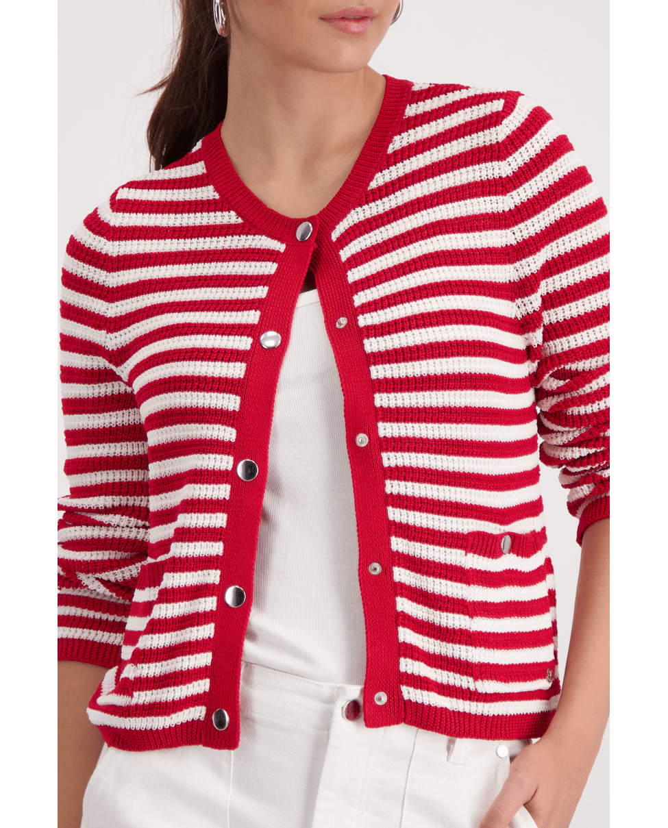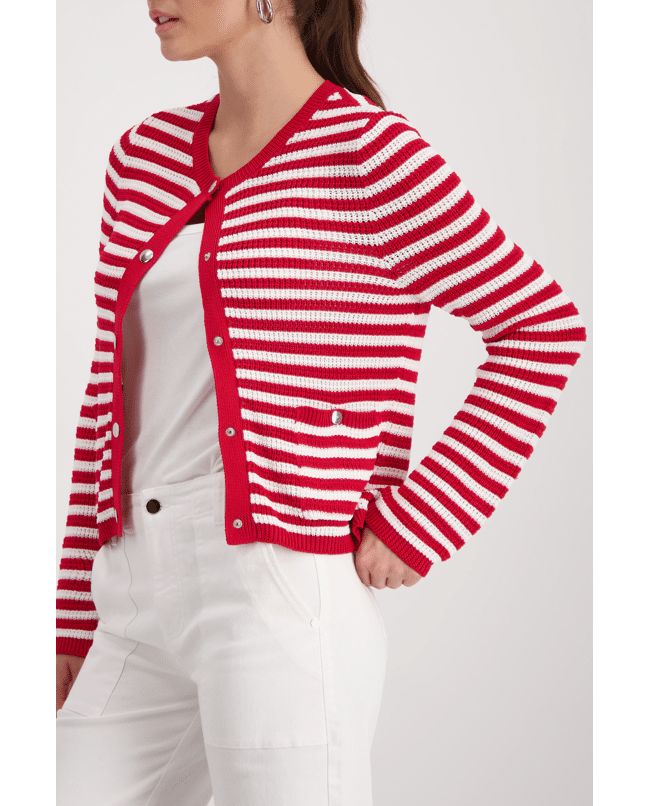 Gebreid damesvest van Monari met horizontale strepen, ronde hals, drukknopen, zakken en lange mouwen