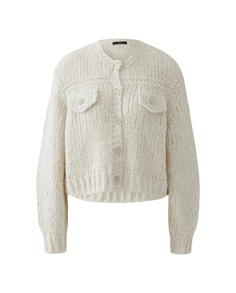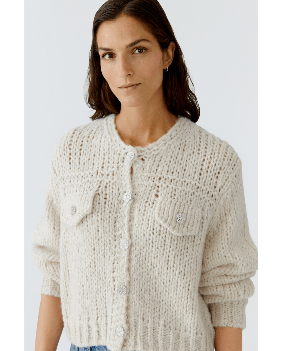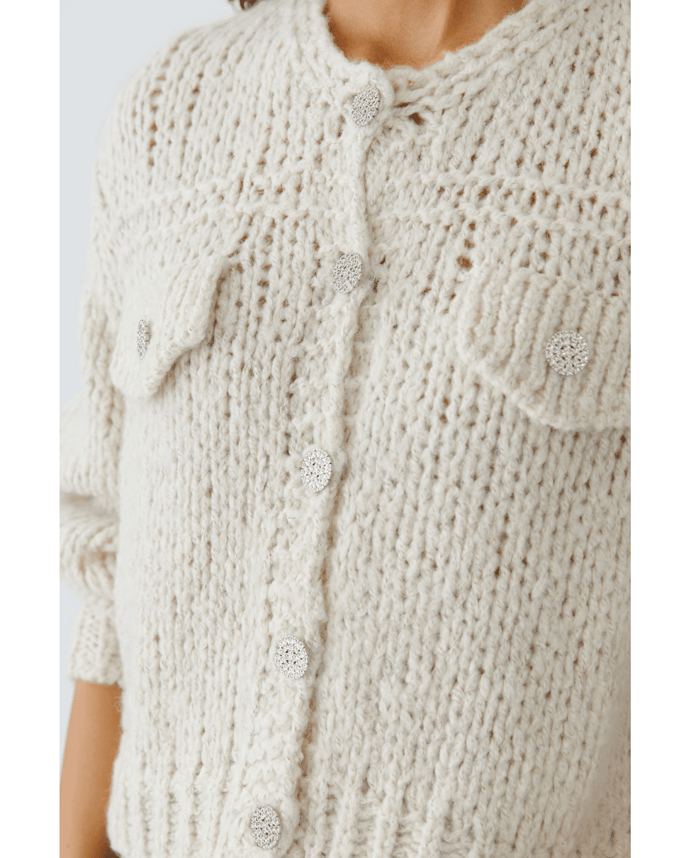 De grove structuur in combinatie met borstzakjes en glanzende knopen geeft een speelse twist aan een klassieke knit.