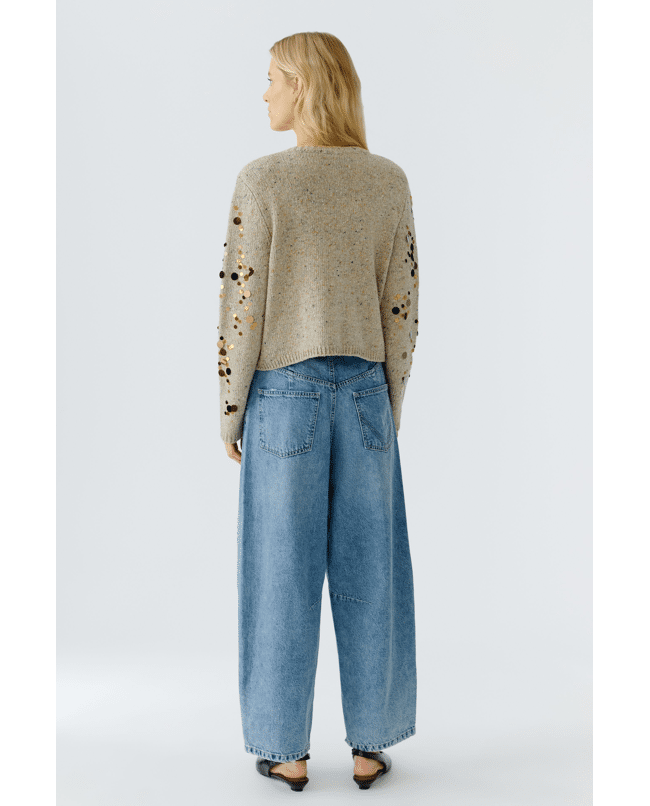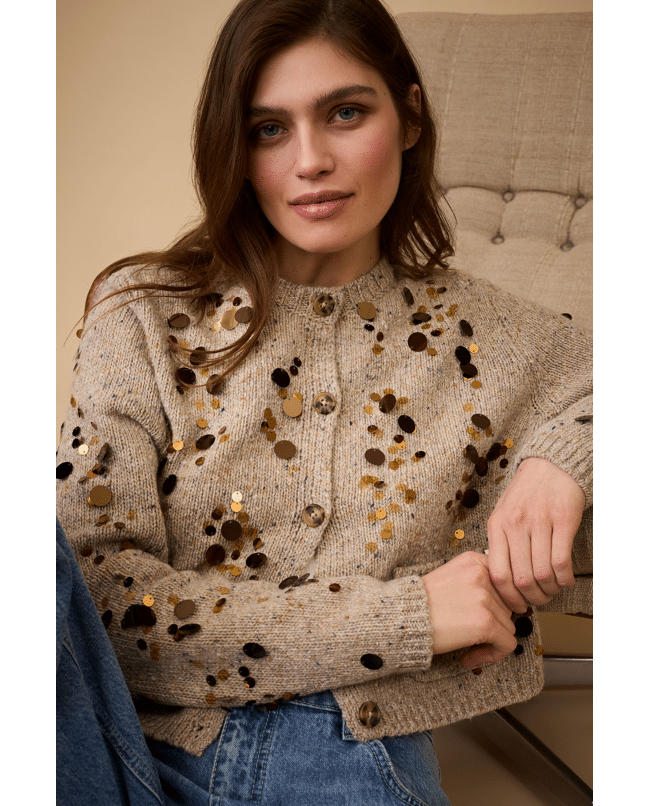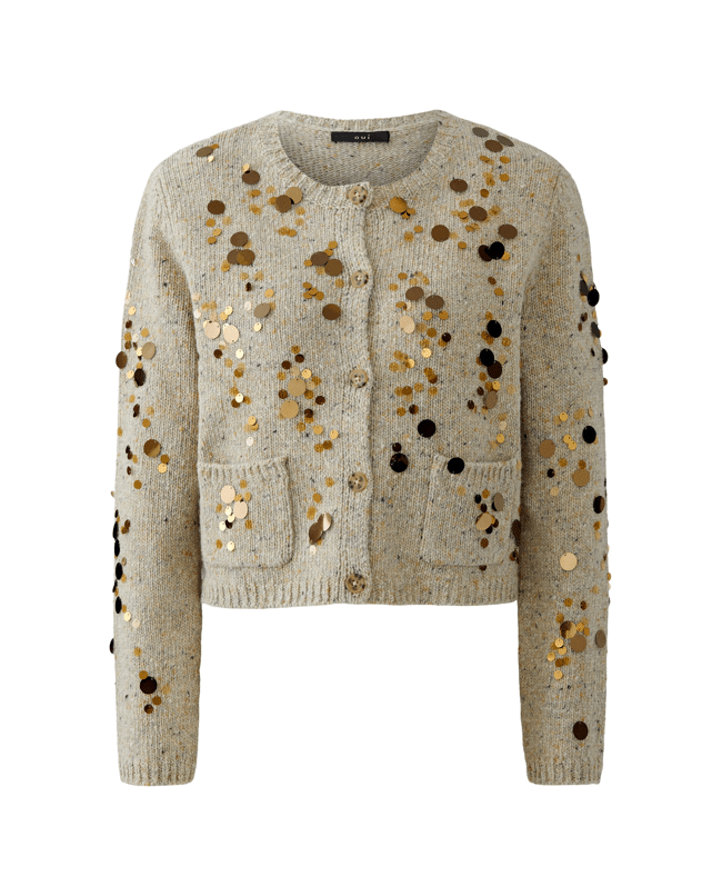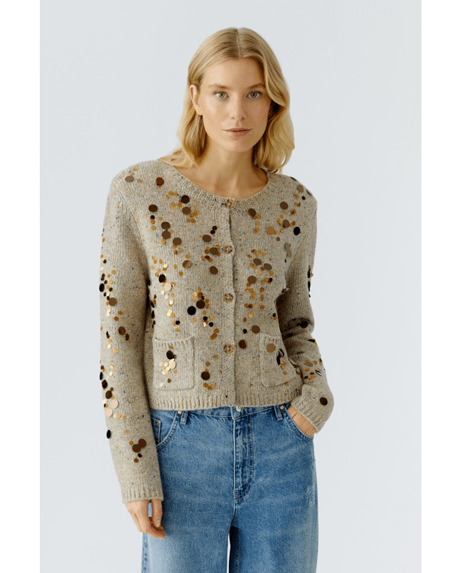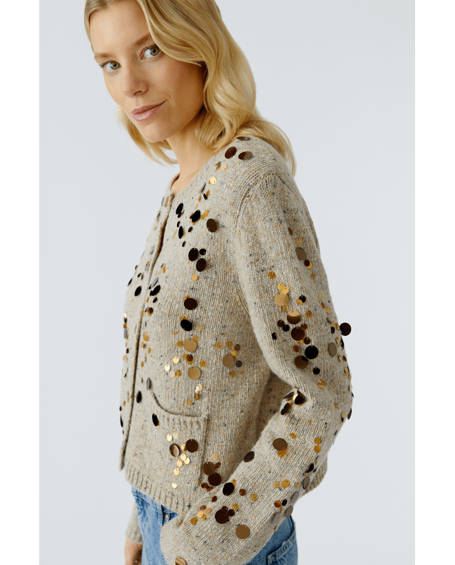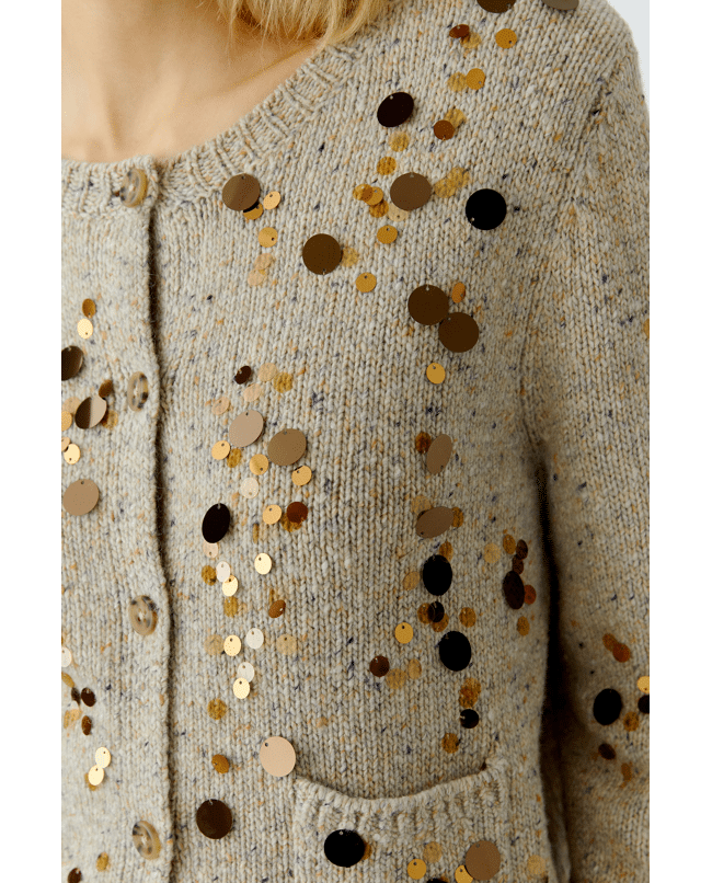 Dit gebreide vest van Oui in offwhite camel krijgt een feestelijke touch door de opvallende pailletten. Met zijn knoopsluiting en kleine zakjes is het zowel stijlvol als praktisch.