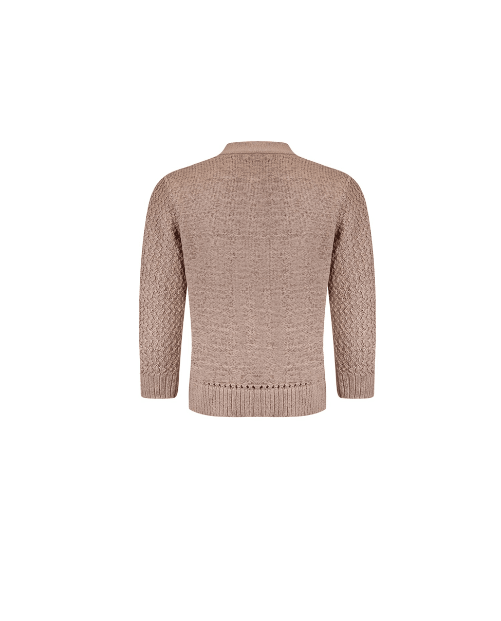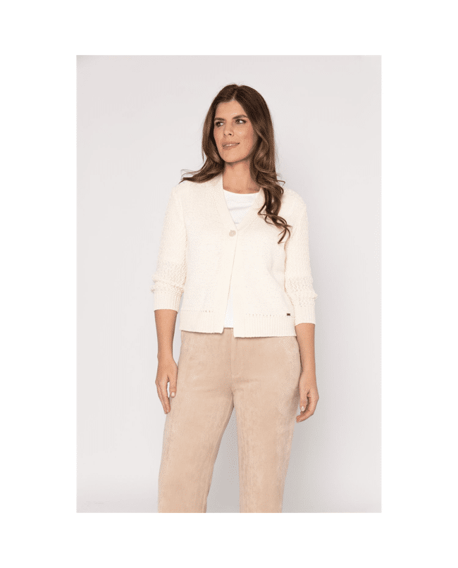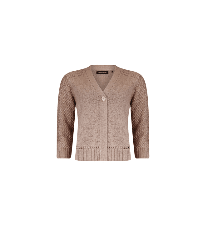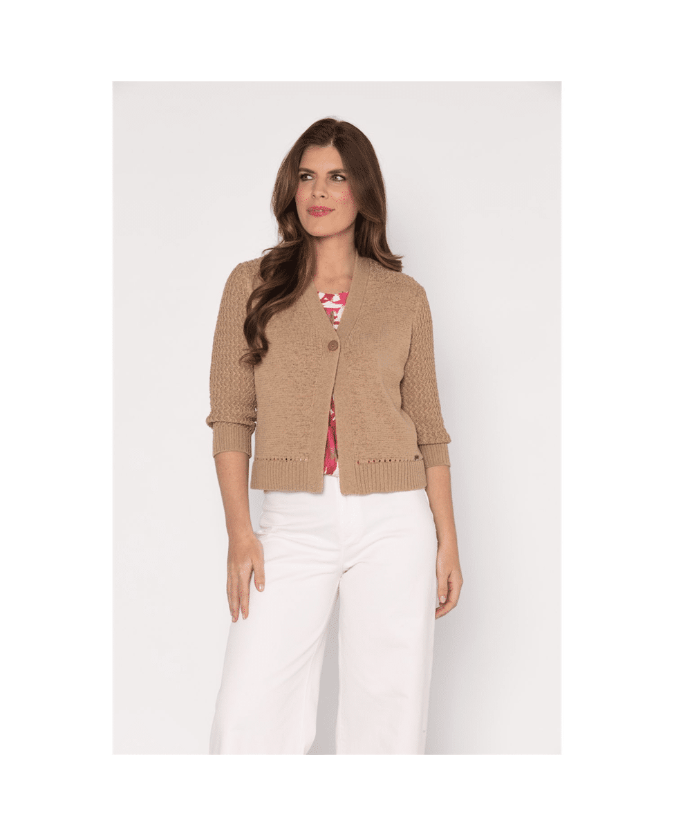 Dit korte dames vest met V-hals in zandkleur is zo’n item dat je er moeiteloos bij pakt. De fijne fancy steek en driekwart mouwen geven het vest een luchtige, verzorgde uitstraling – perfect voor frisse lentedagen of als extra laagje in de zomer.
