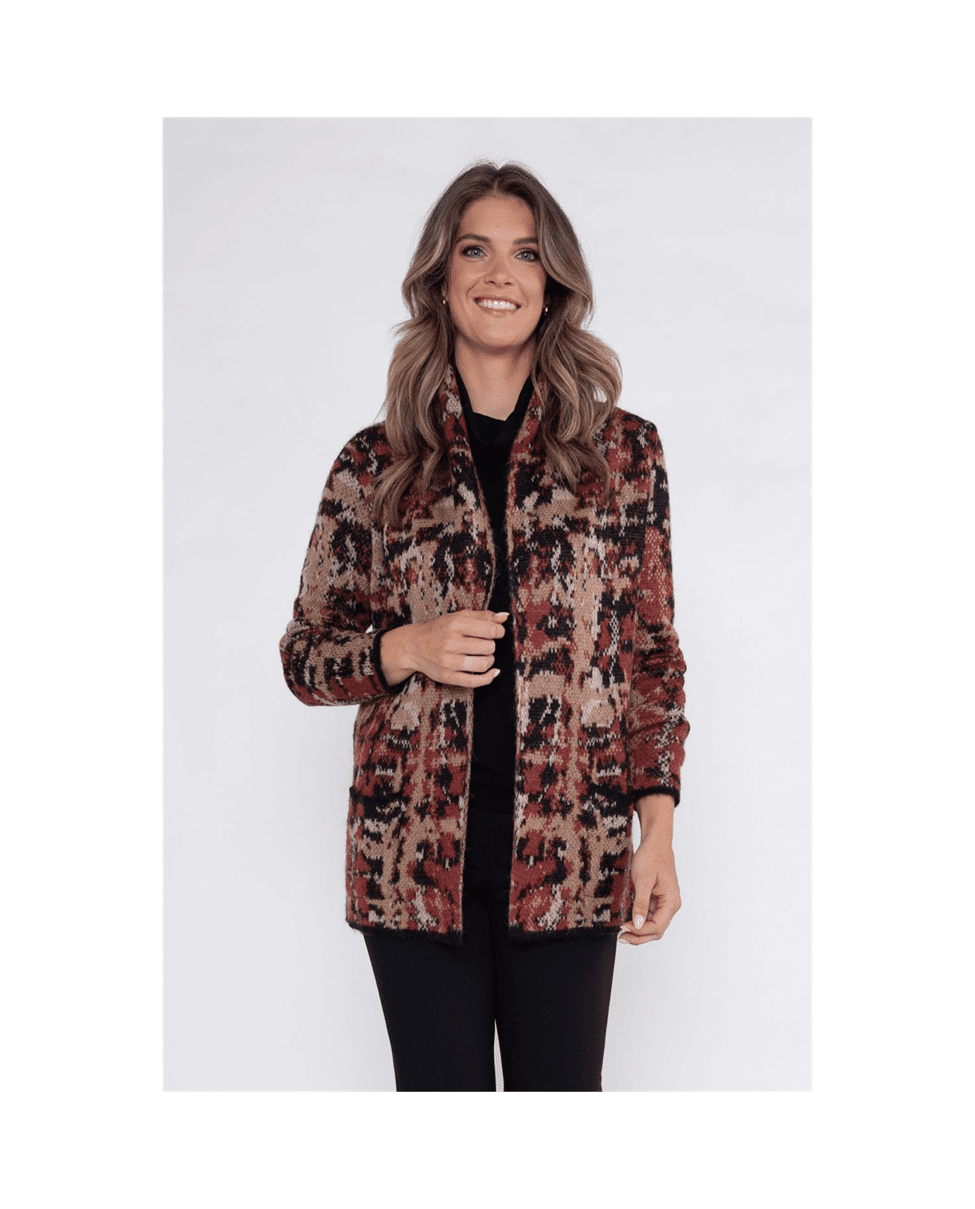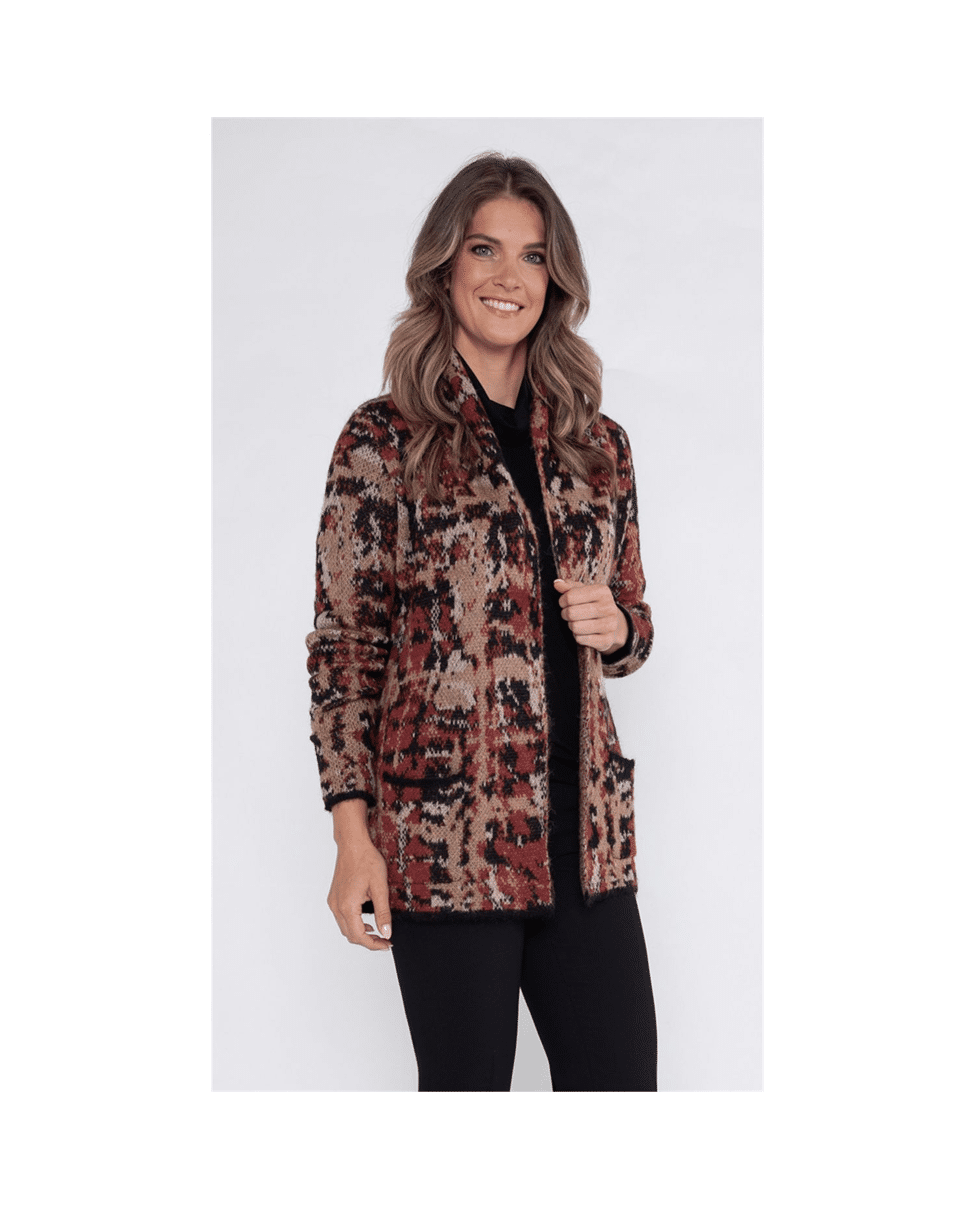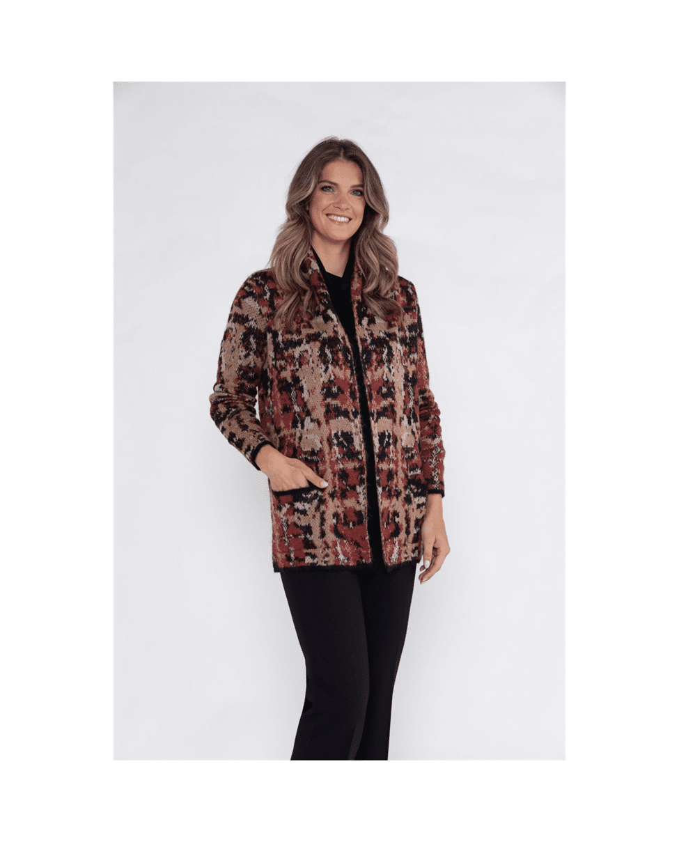 Een stijlvol vest met sjaalkraag, uitgevoerd in een rijke mohair-mix met jacquard dessin. Het langere, luchtige model voelt licht aan en is ideaal voor de koelere dagen van het seizoen.