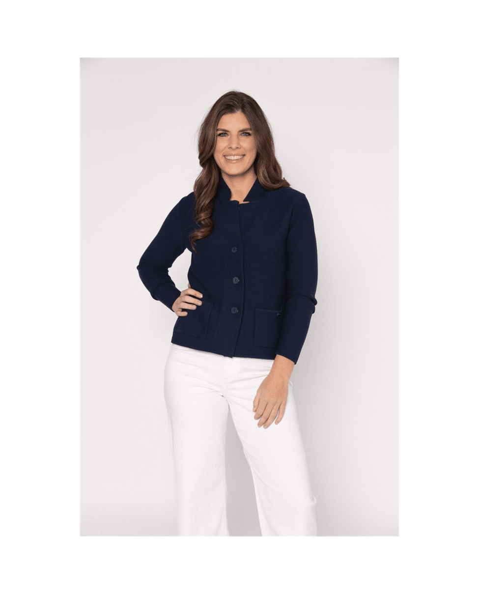 Kort dames vest-jasje van Roberto Sarto in tijdloos navy. Dit gebreide vest combineert het comfort van knitwear met de uitstraling van een jasje. Mooi als stijlvol laagje over een top of blouse in het voorjaar.